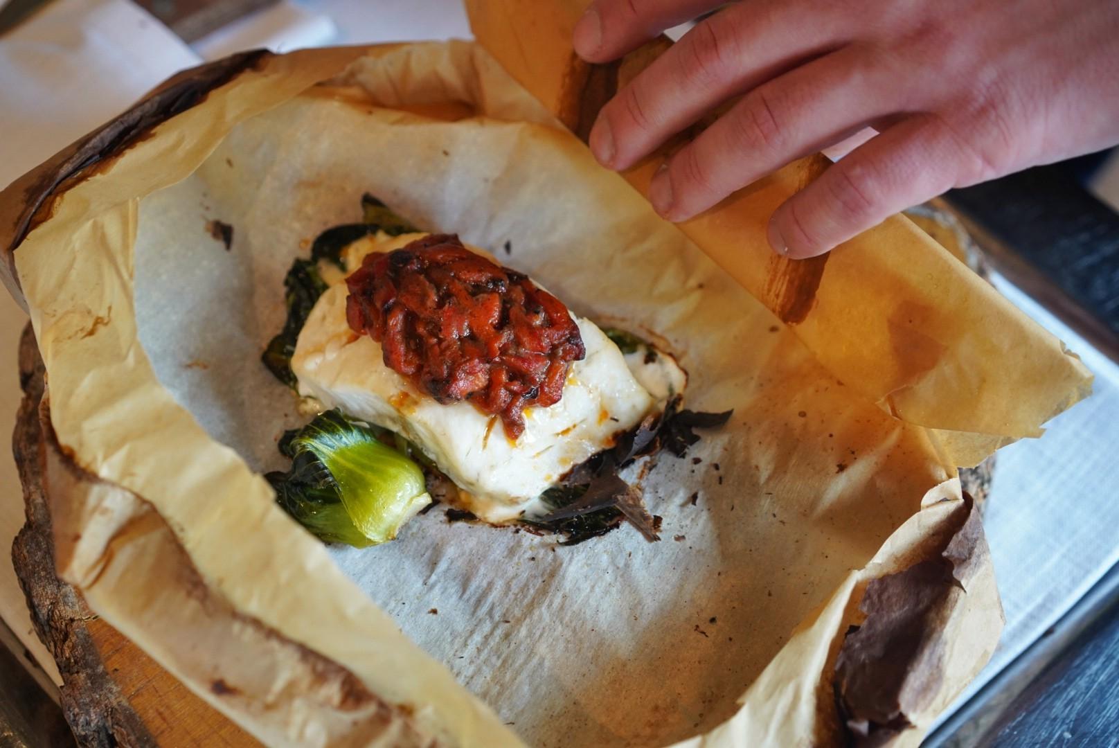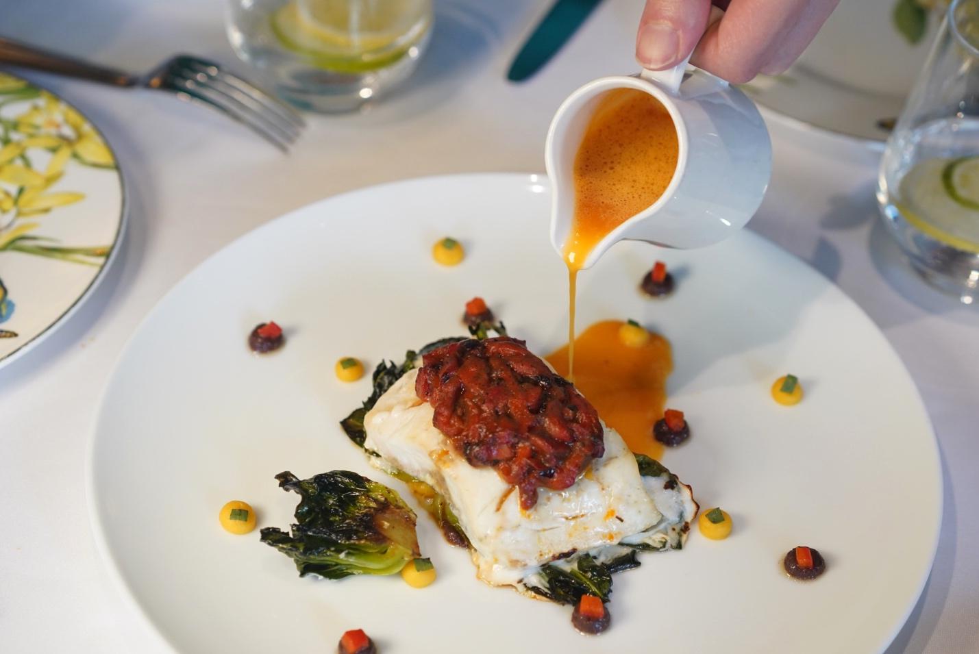 Cooked in papillote, the Sea Bass Steak (RMB429) is capped with a blend of red bell peppers and anchovies before being wrapped in baking parchment and roasted over Shanghainese bok choy.