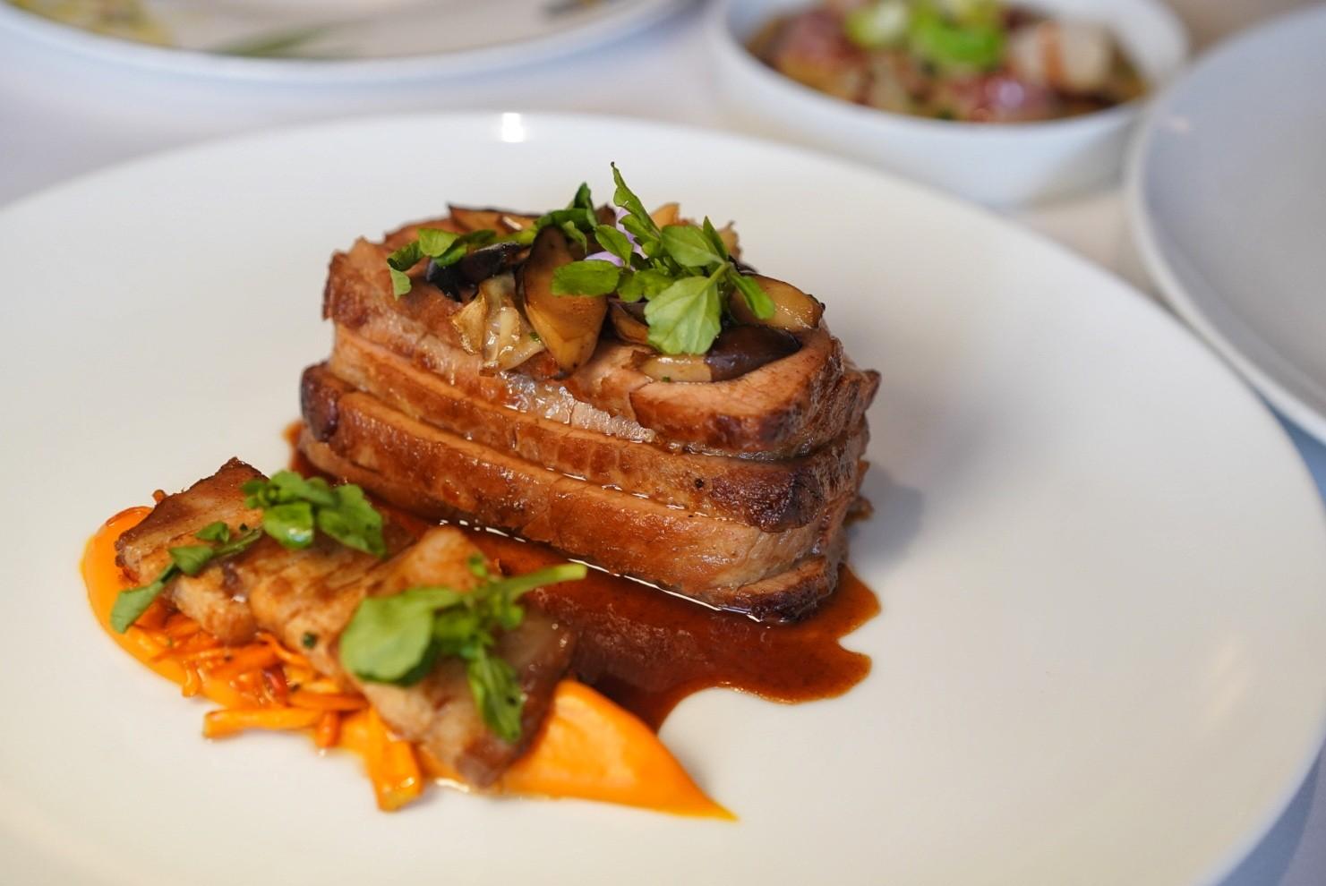 Onto the mains, thick stacked slabs of Roasted Iberico Pork Loin are seasoned with herbs de Provence, crowned with a pan-fried mushroom fricassee. Flanked by a golden thread mushroom-topped creamy roasted sweet potato mash, braised pork belly is dribbled with a mango peel and coriander seed jus.
