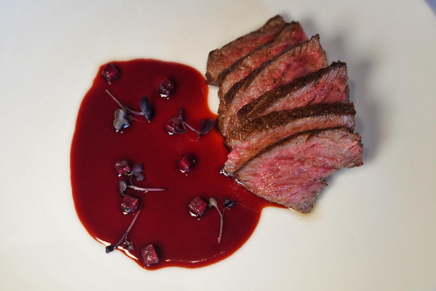 Vibrantly ruby-hued beetroot and beef jus reduction pools around succulent M5 Wagyu Beef Flap (RMB388 supplement) dusted with pink peppercorns, contributing both savory and earthy undertones to this bovine course.