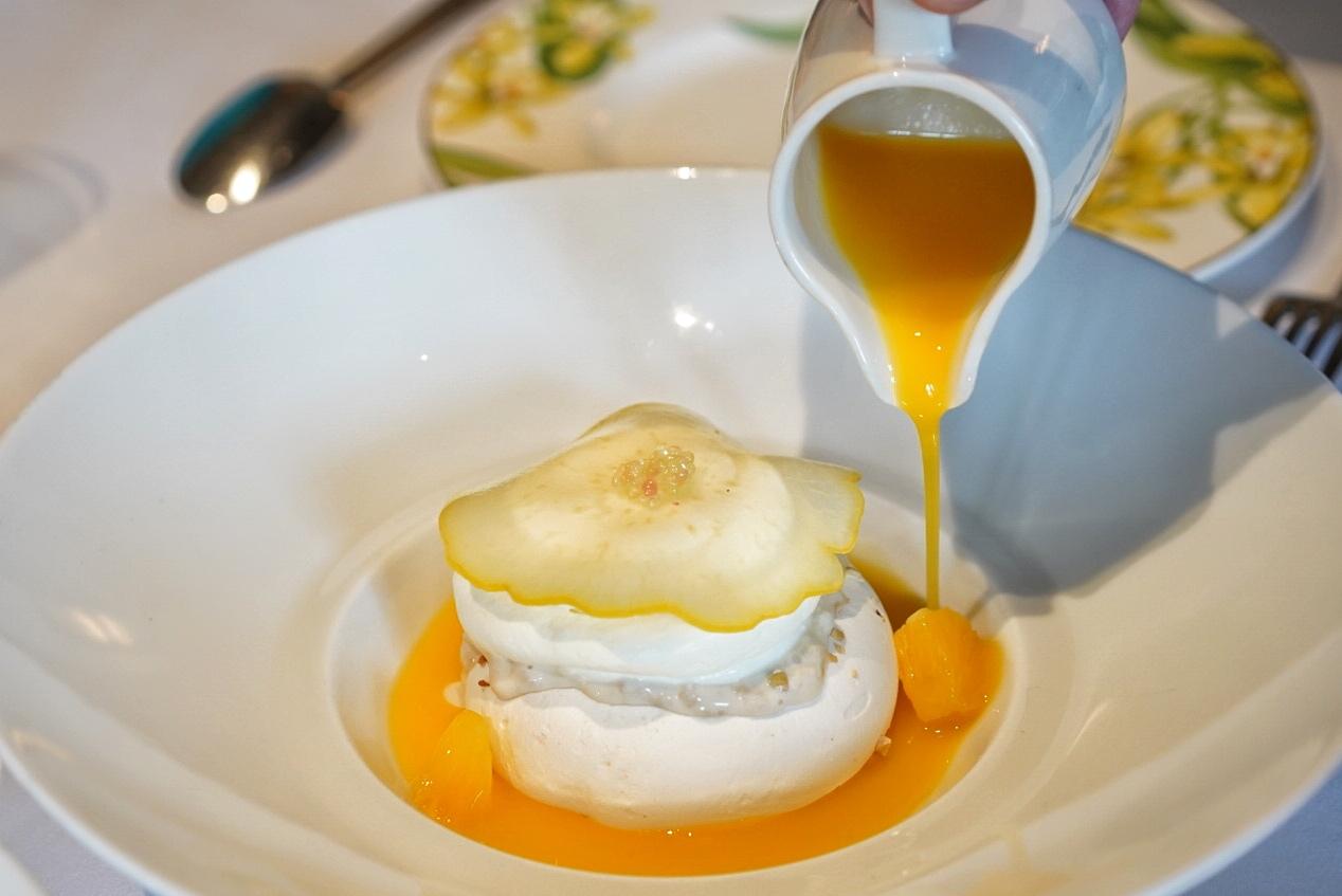 Lunch desserts range from Rice Pudding – a lasagna-like layering of crunchy meringue, salted caramel drizzle, a scoop of lemon sorbet, a tuft rice foam, and a Buddha’s hand veil, all encircled by a mandarin sauce…