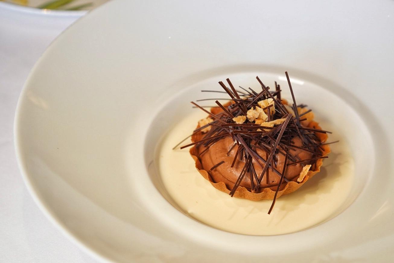 ...to a Muscovado Biscuit tart piped with 67% chocolate ganache, milk jam, yogurt ice cream and soft vanilla panna cotta, crispy shards of chocolate imparting a textural crunch.