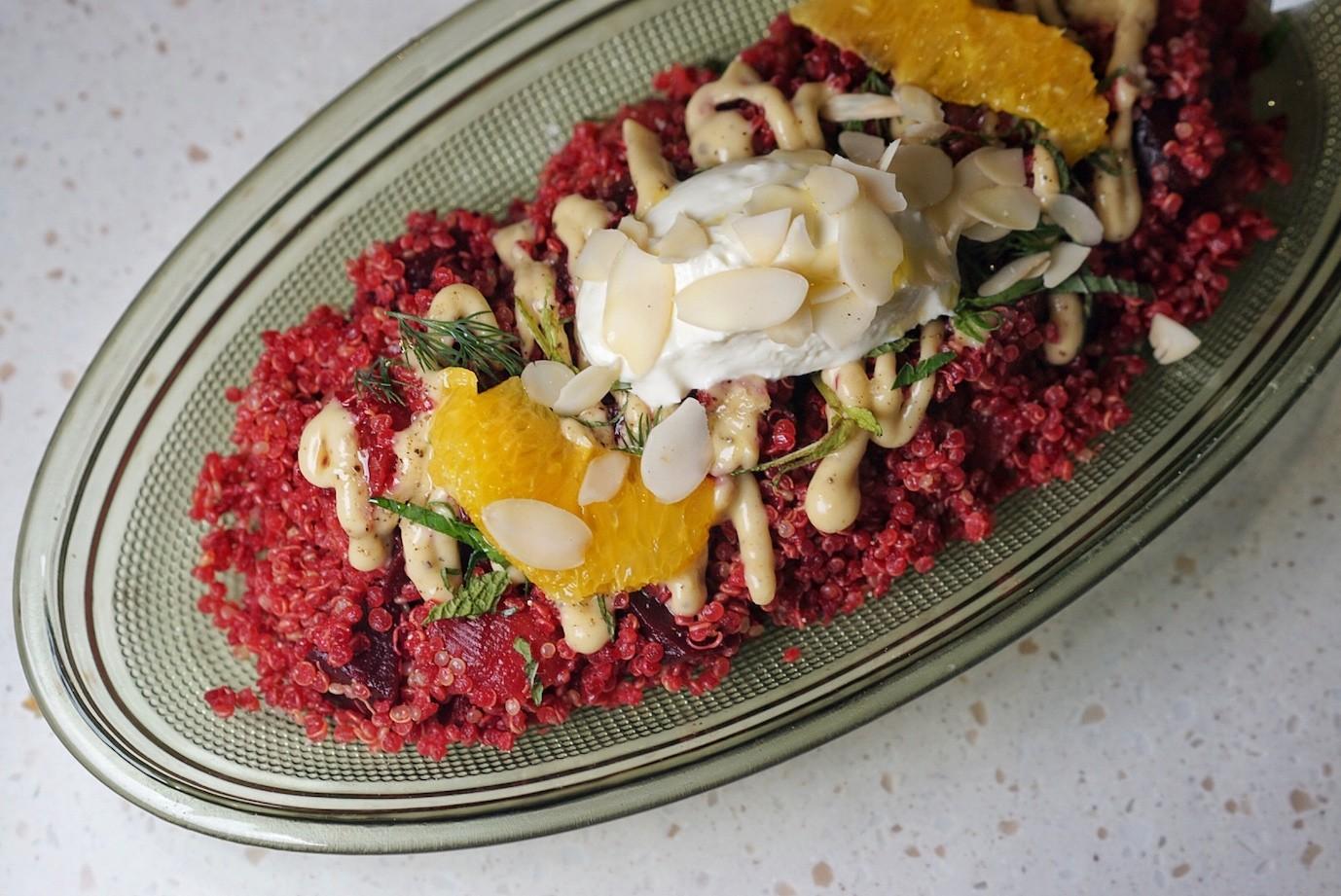 Pink-tinted quinoa kernels serve as the base of the Beetroot Salad (RMB48/whole, RMB20/side), dressed simply with a homemade creamy vinaigrette. Soft chunks of sweet beetroot, orange segments, slivered almonds and fresh herbs are topped with a velvety mound of creamy labneh – a Greek yogurt-like soft cheese made from strained yogurt.