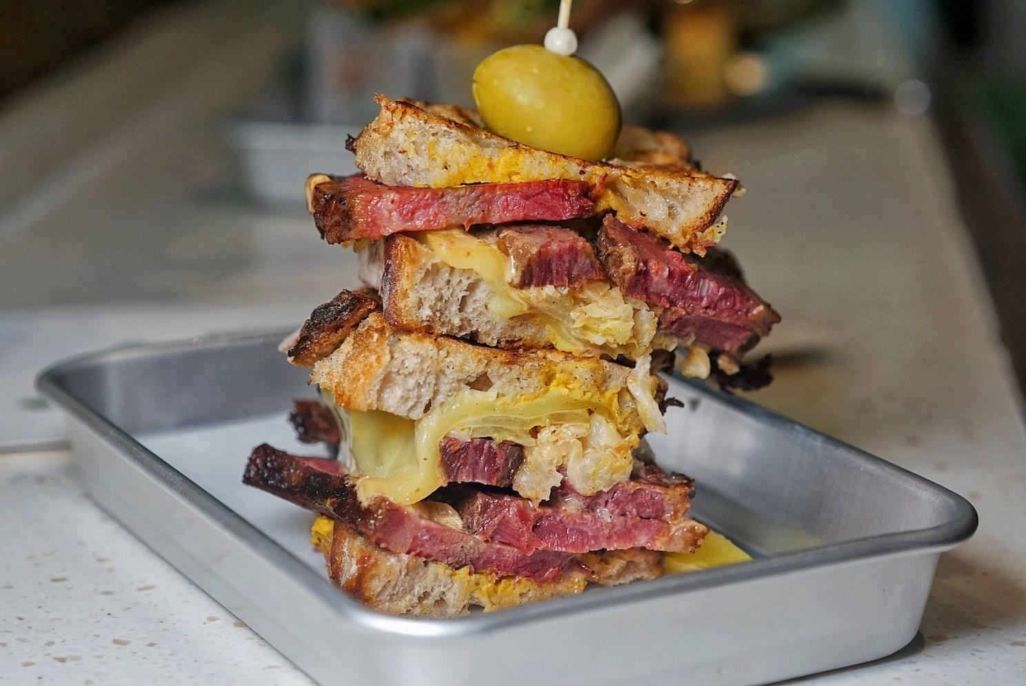 The components of the sandwich are experienced individually rather than amalgamated, cyborg-like, into the whole. The thick-cut pastrami, the pungent emmental, the pickled sauerkraut, the Russian dressing bolstered by the marinades’ drippings for extra flavor – every individual item is there to be tasted.