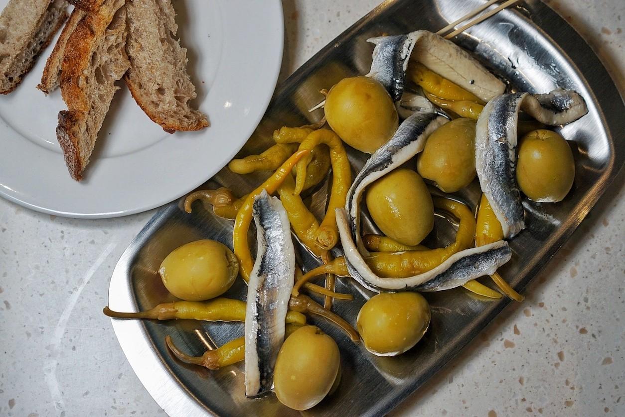 An indication of what’s to come for the snack-focused dinner menu – designed to act as complimentary finger food for alcoholic libations – the Gilda Plate (RMB58) is a textbook example of the original pintxo from San Sebastián that helped put the culinary Basque powerhouse on the map. A briny combination of Spain-imported white anchovies threaded through green olives and paired with pickled hot guindilla chilies is exactly what we want to pair a frosty glass of vermouth with.