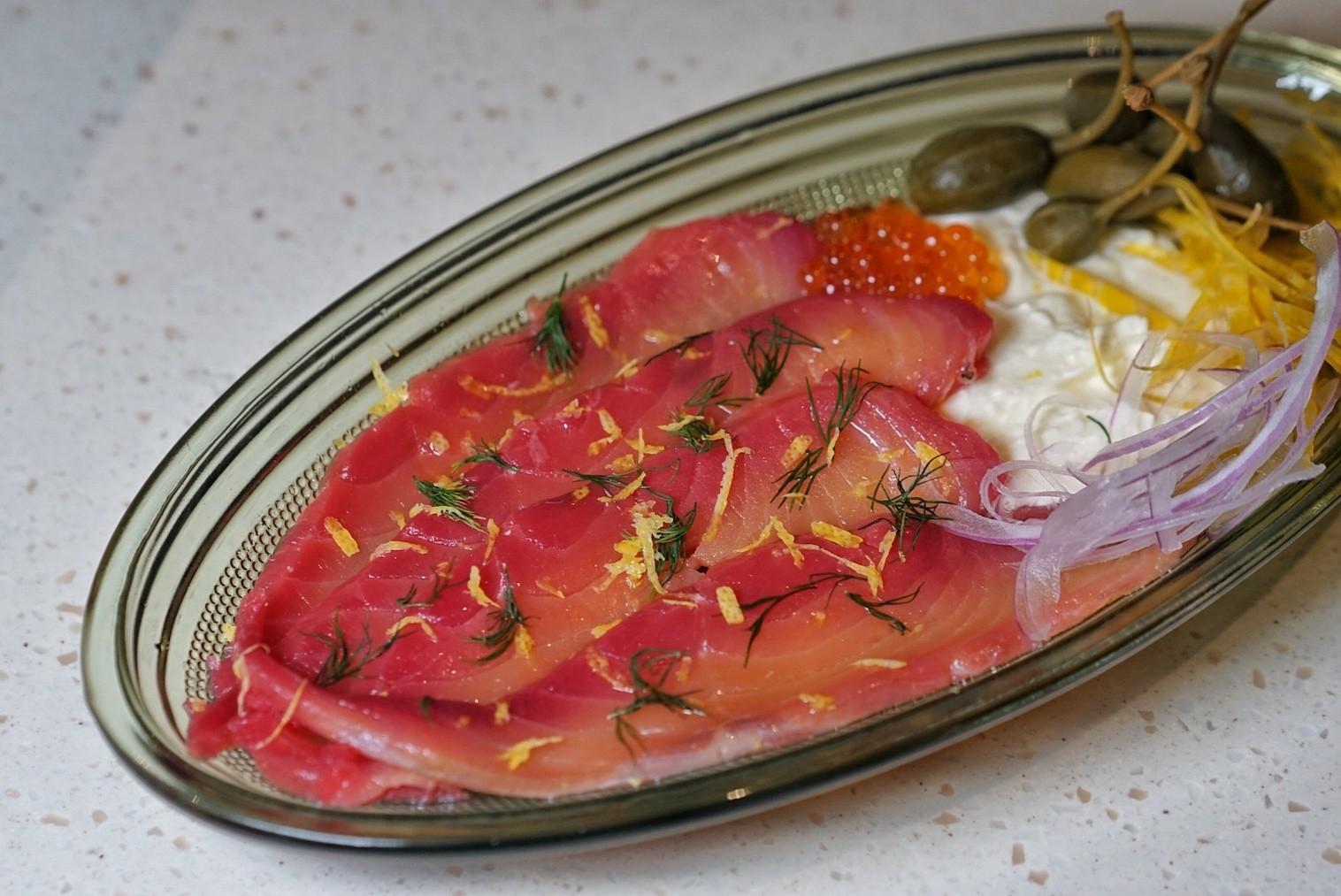 Whole caper berries perch atop a skim of more of that luscious labneh, dusted with lemon zest and fresh dill. Orange pearls of salmon roe pop with flavor, releasing mini tidal waves of the sea in each bite.