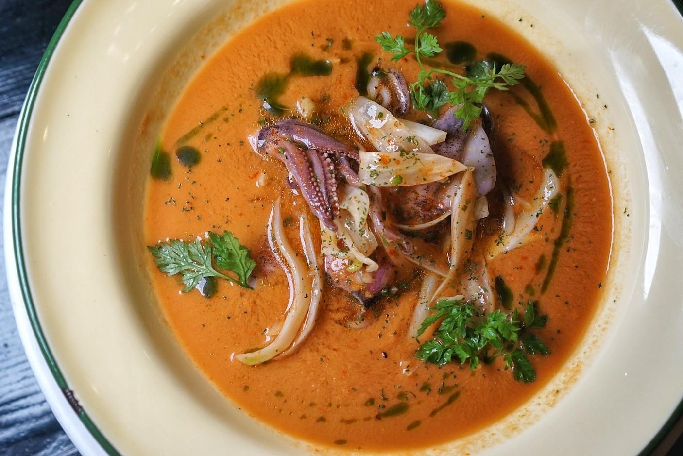 Despite hailing from Spain, a thick bowl of Gaspacho (RMB125) makes its way onto this French countryside-leaning menu, adorned with a baby squid salad and shaved fennel. Deep in flavor with a peppery spice, this exemplary plate gets a boost of protein from tender mollusks.