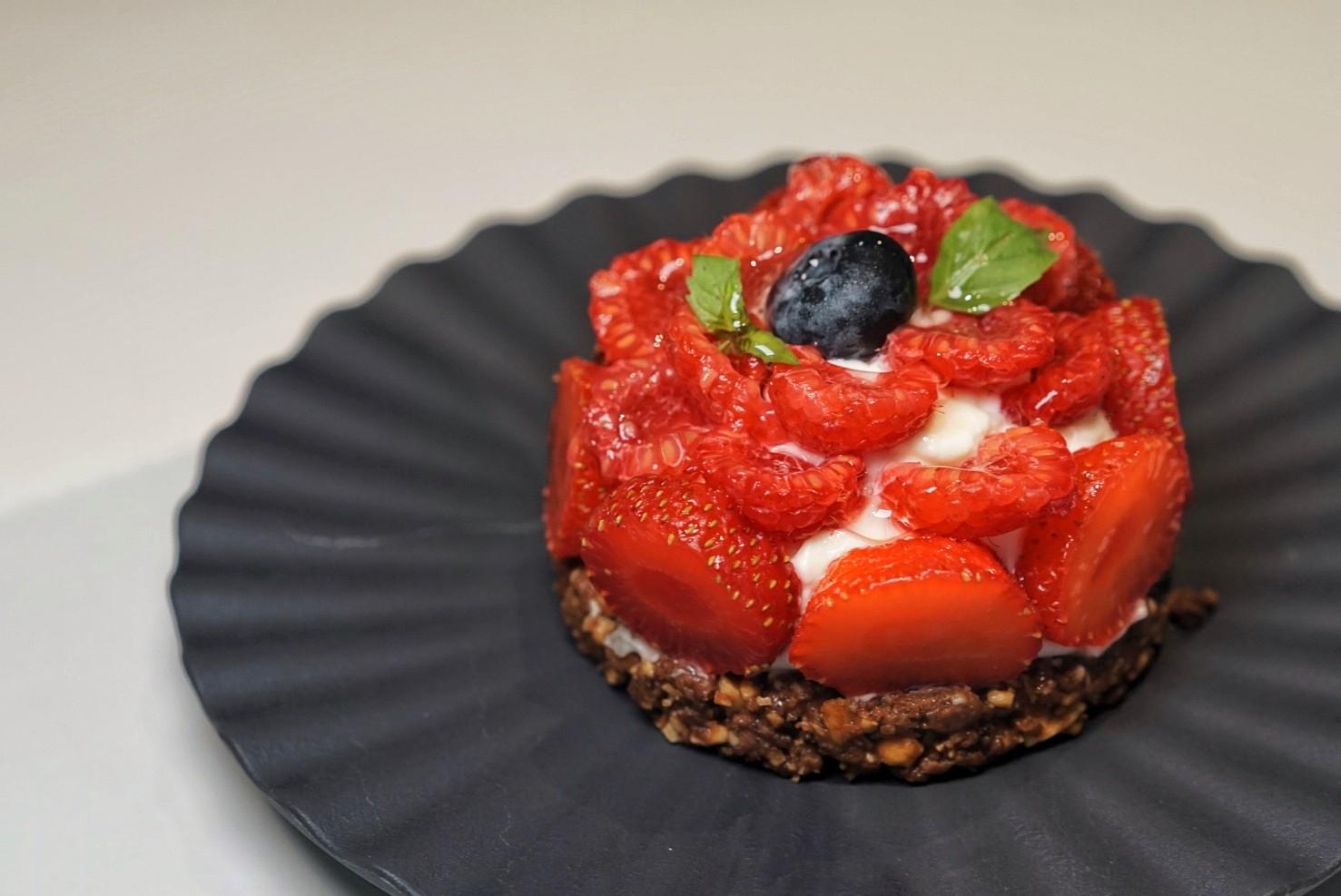 Sliced raspberries and strawberries stud the top of the Tarte aux Fruits Rouges (RMB88), a layered dessert composed of a walnut crumble bottom, a basil-infused cream center, and fresh summer fruits on top.