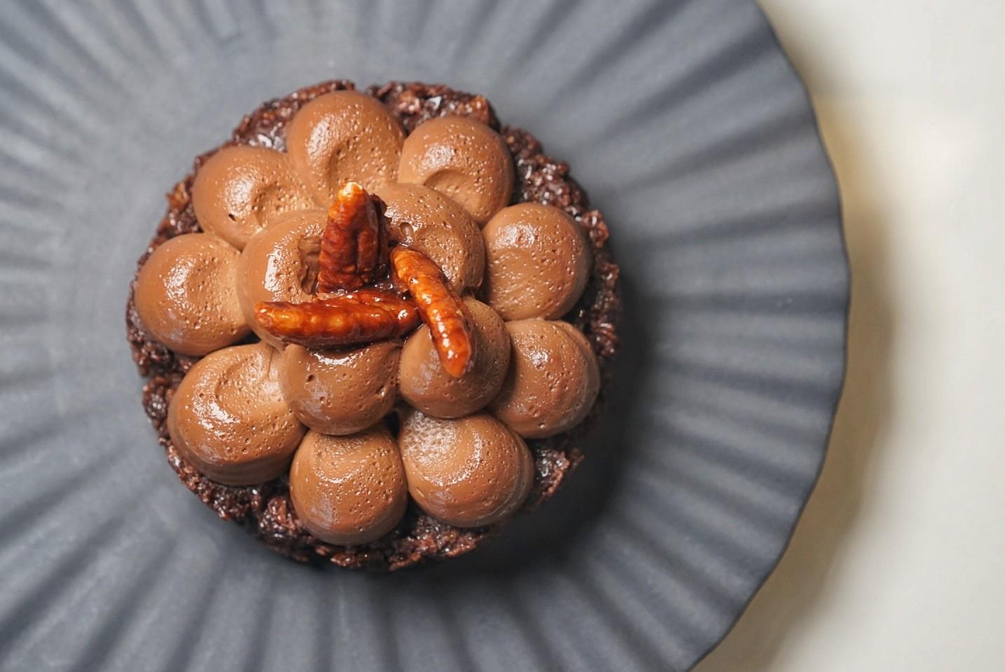 A contrast to the daintier desserts, the Tarte au Chocolat (RMB88) is bold and rich, with 72% cacao cream piped into globules atop a dense cocoa crumble, garnished with candied pecans.