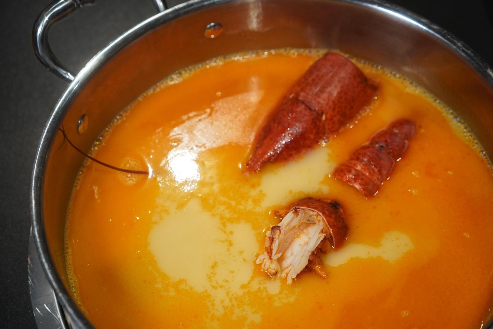 The broths span: Herbed Oxtail; Pig Stomach with Chicken and White Pepper; Guizhou-style Sour Tomato Fish Soup; collagen-rich Fish Maw and Chicken Golden Broth (one pot uses four whole chickens!); and 8-hour simmered Boston Lobster and Shrimp Head Oil.