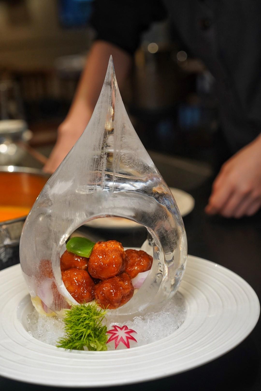 ... a song of ice and fire with Cantonese Sweet and Sour Pork (RMB98), the sauce’s stickiness amplified by the ice teardrop custom-built contraption it’s served in…
