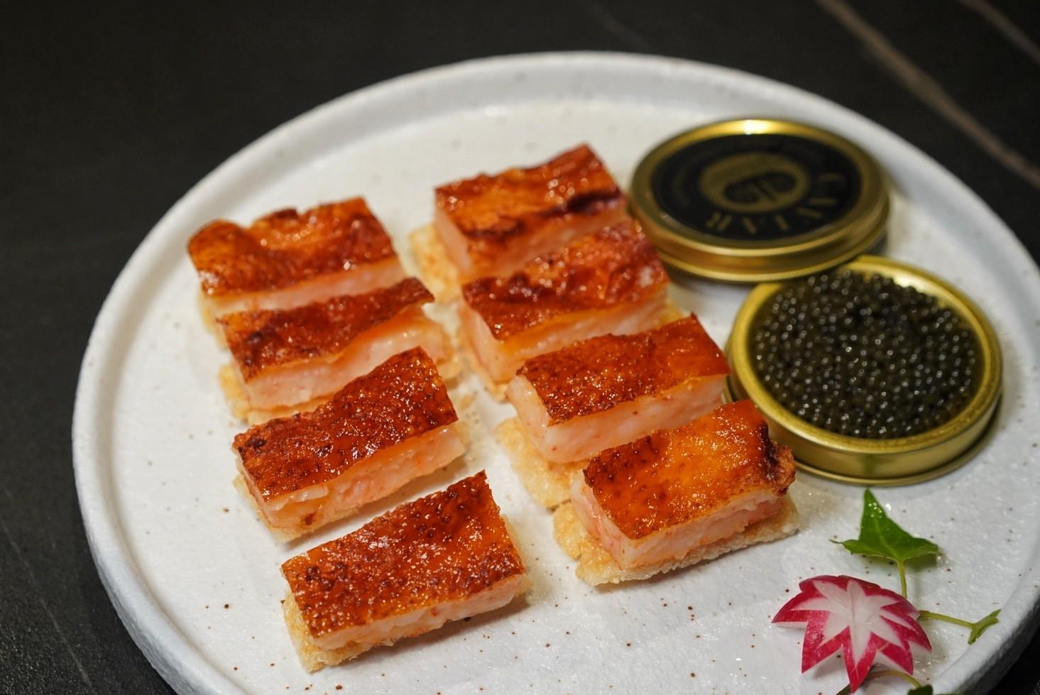 ... an indulgent play on Jiangnan Shrimp-Stuffed Chicken with Caviar (RMB198) – an inception of a plate with fried chicken skin sheathing pounded and steamed shrimp (instead of chicken meat) atop a fried glutinous rice crisp, all adorned with caviar…