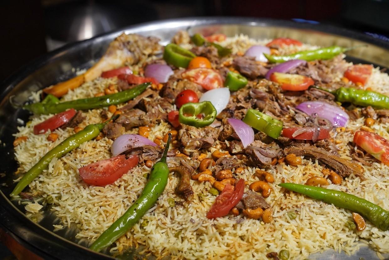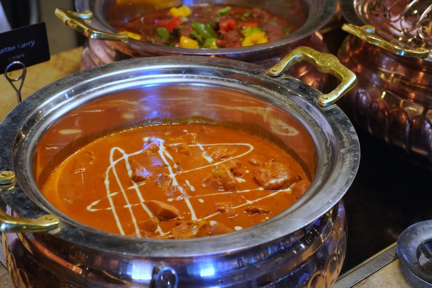 Succulent tandoori grilled meats and vegetables, rich mutton curry, mixed vegetable curry, gravy-like butter chicken, rajama daal, basmati rice, plus dips and cold dishes like mouhammara spread, grilled eggplant, grape leaf dolma, hummus, mashed lentils, Greek salad, pita, Turkish bread.