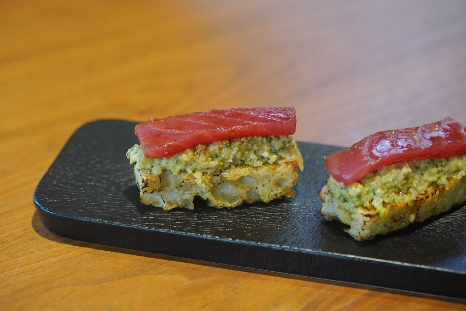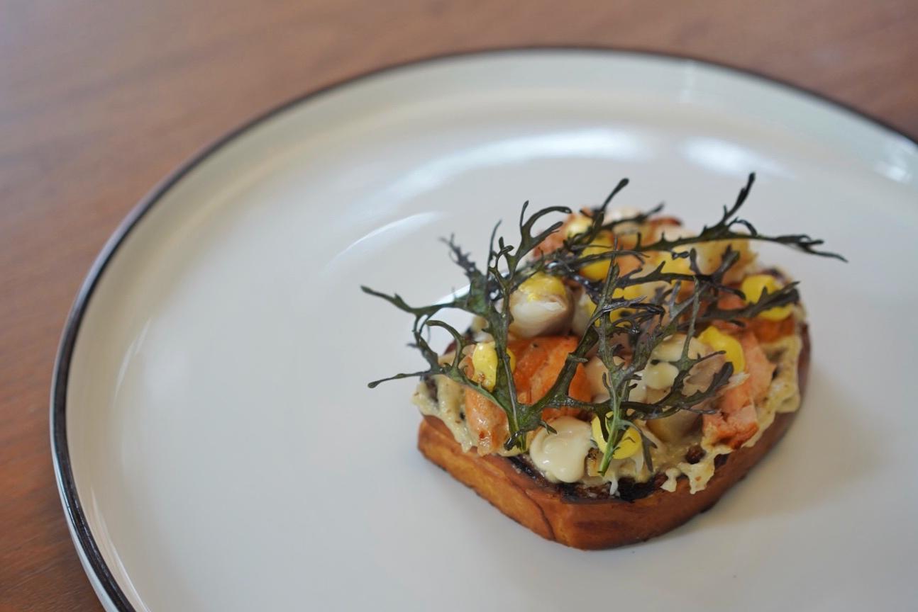 Perched atop plush, grilled Japanese milk bread, succulent chunks of salmon yakitori and oil-poached codfish are shmeared in a sweet corn aioli and parmesan foam as the Broken Fish Bruschetta (RMB148).