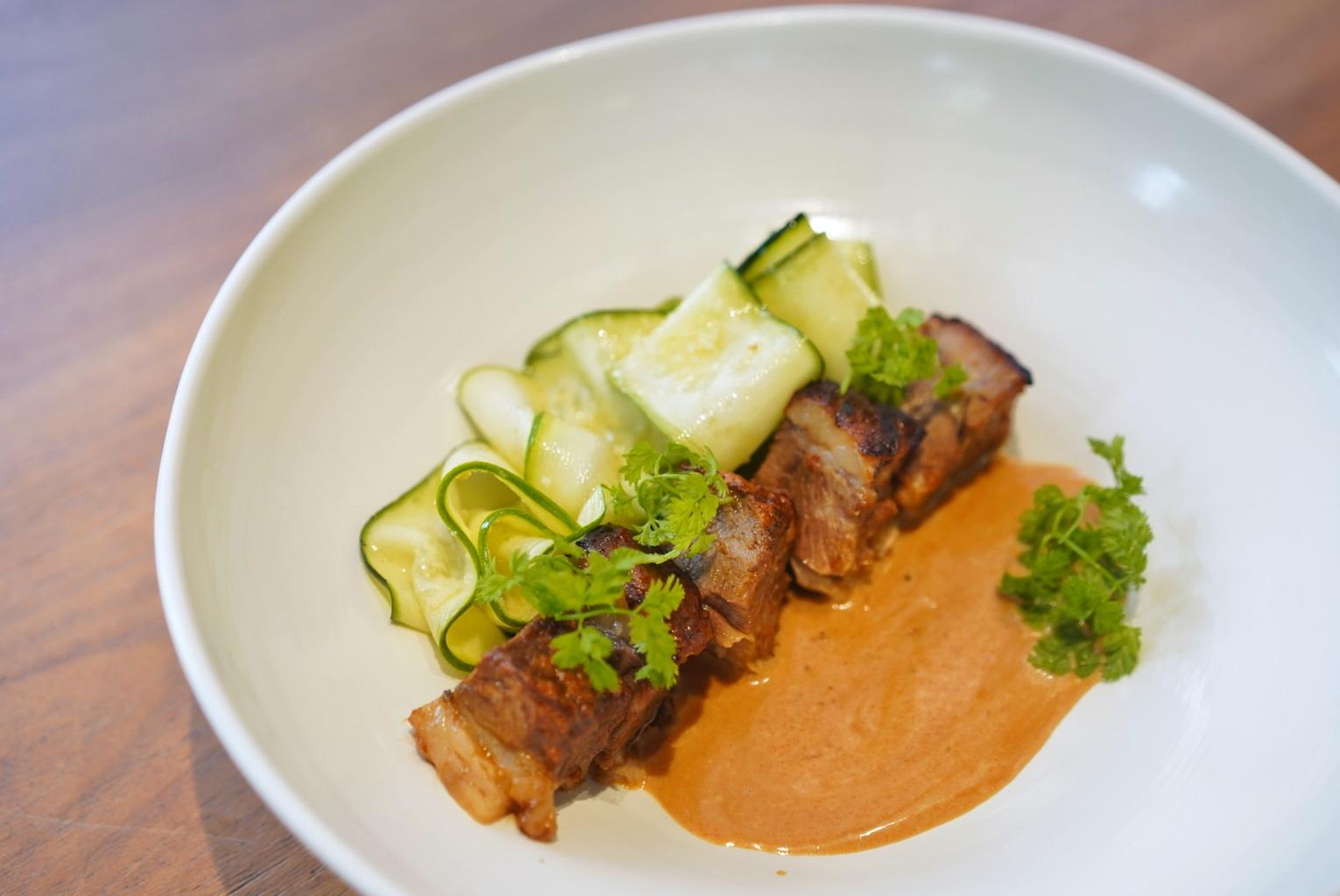 Slow-roasted overnight, the Wagyu Brisket (RMB198) sits in an Indonesian ajam pedis satay sauce, softened by coconut milk, and flanked by curling ribbons of zucchini salad.