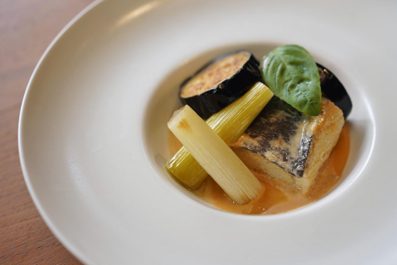A pudgy slab of sous vide halibut, marinated in olive oil and garlic, is slathered in said curry, alongside confit eggplants and leeks.
