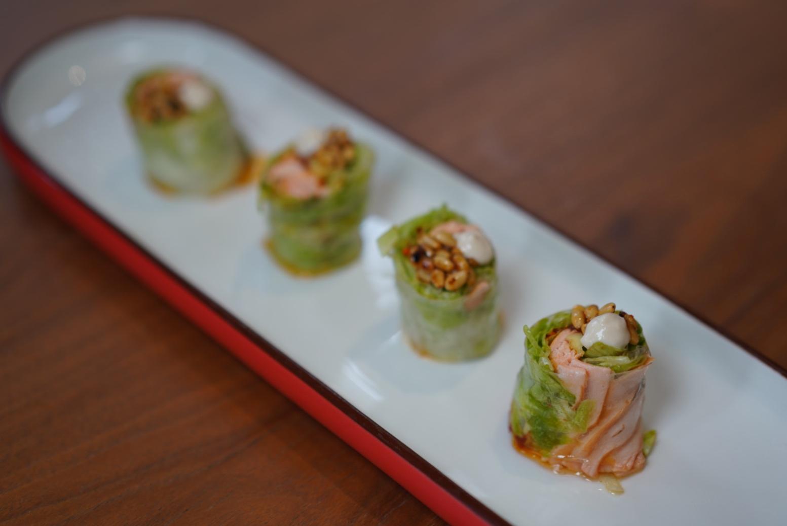 A creamy moat of shitake and truffle black pepper mushroom sauce anchors the rolls to the plate, adding earthy undertones to the bite.