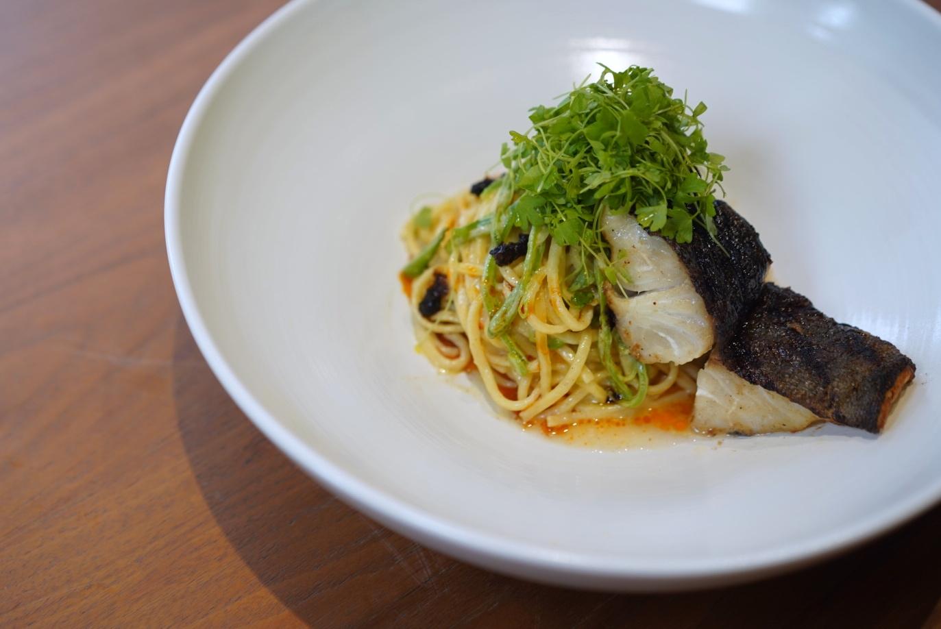 Chicken bone stock, yogurt and Chinese shaokao grill spice are reduced into a rich broth before being blended with more yogurt, resulting in a slick coating that sticks to each individual homemade noodle strand, enhancing the cod’s oceanic sweetness when savored together in one mouthful.