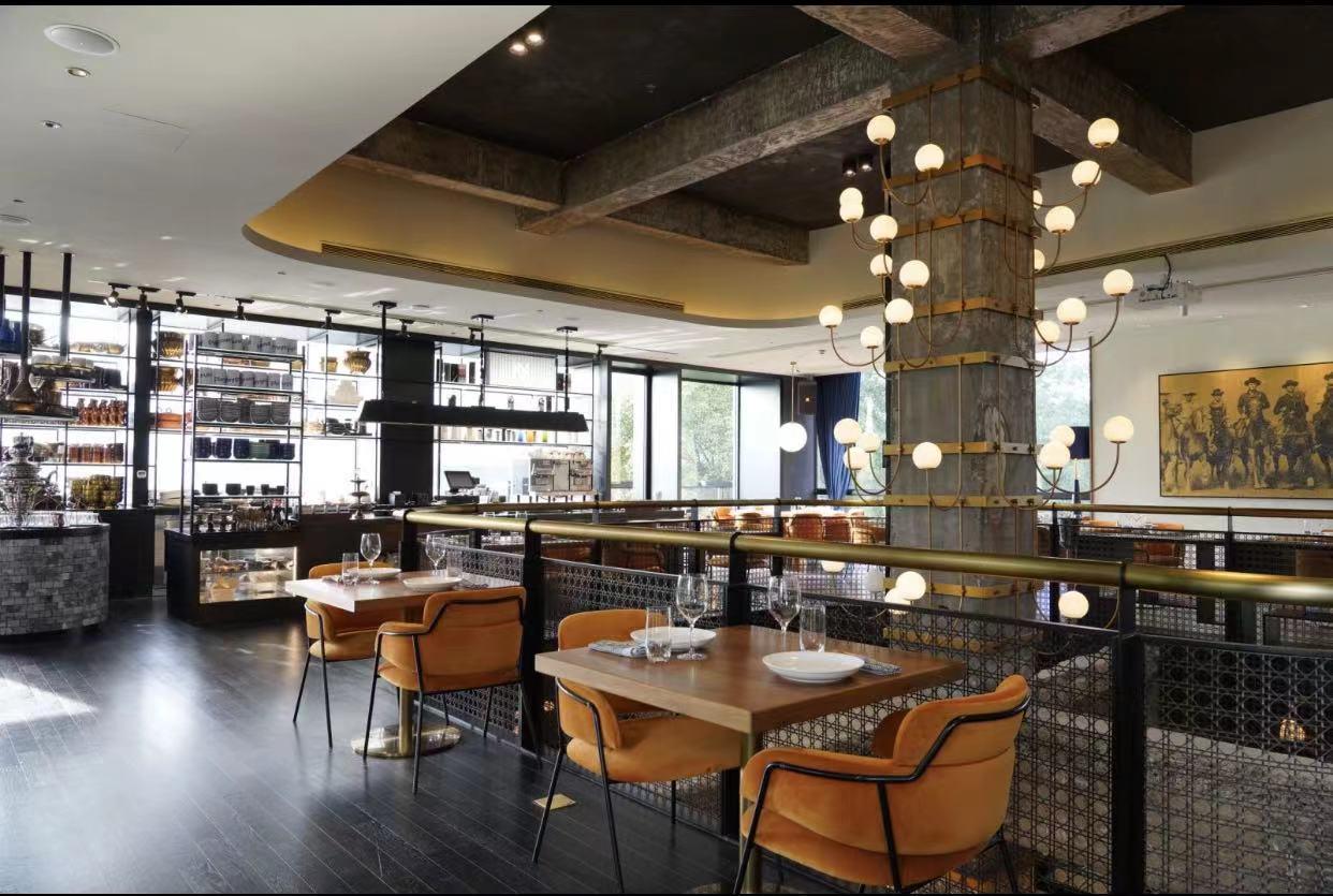 The second floor plays host to an open dessert bar with an outdoor terrace and a more Western chic feeling dark wood private dining room.