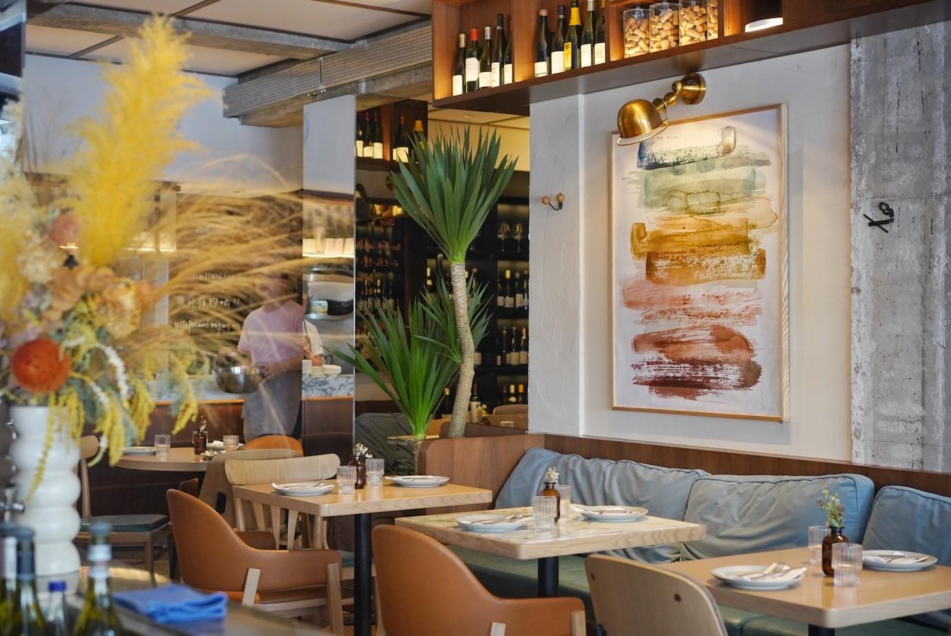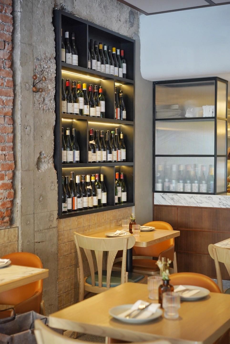 The cozy atmosphere evolves from casual café vibes during the day into a hip wine bar atmosphere by night, accented by exposed antique brick, unfinished industrial chic concrete walls, alternating marble and bleached wood tables, and a plush cushioned banquette lining the western wall.