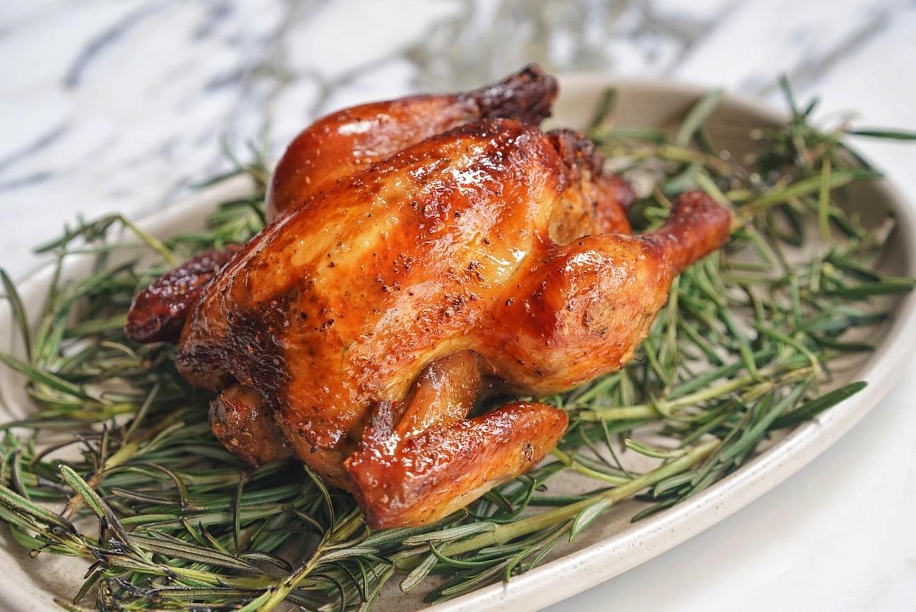 Next roasted, the fowl is served atop a bed of aromatic rosemary fronds.