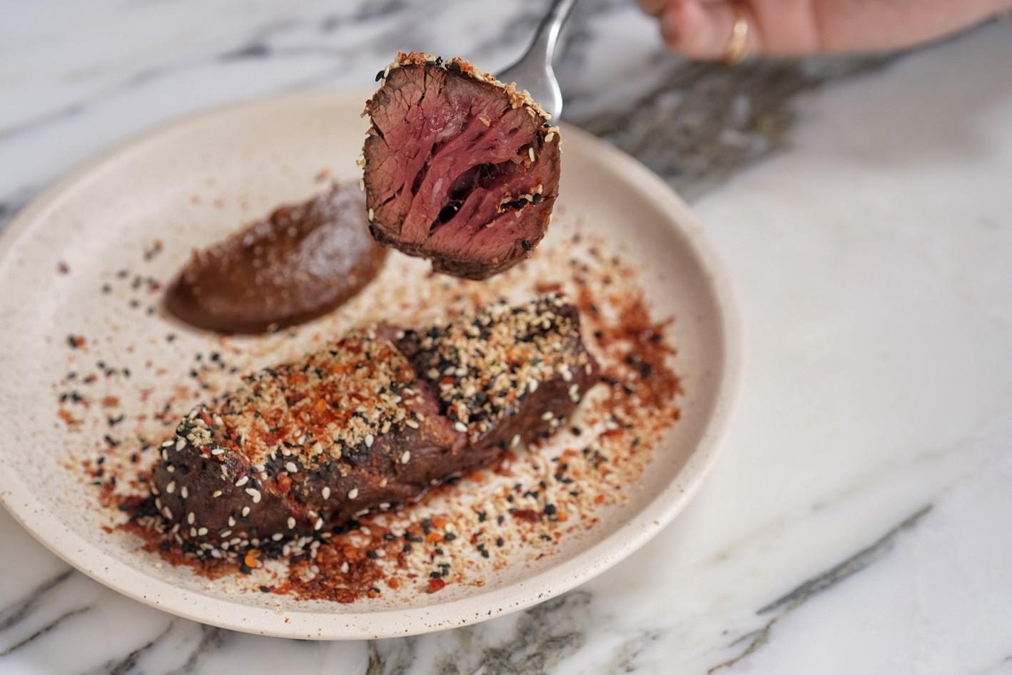Rosy pink M7 Wagyu Flap (RMB268/180 grams) is grilled to a delicate medium rare, slathered in a soy caramel and crusted with fiery er jing tiao chili, crushed cashew, and sesame seeds.