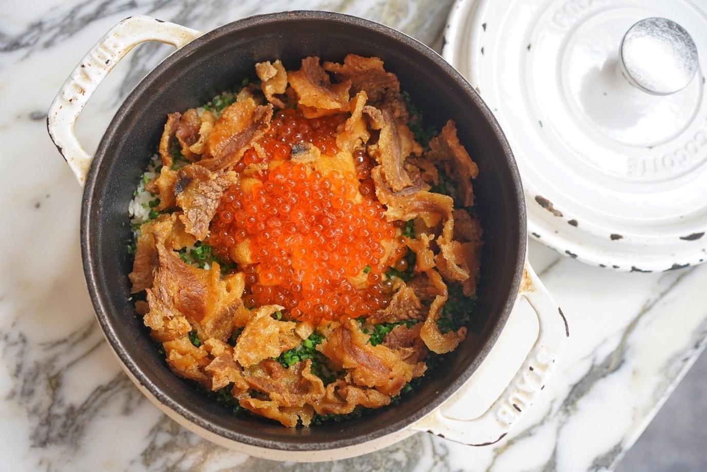 Uni Pot Rice (RMB288) Sea urchin, salmon roe, pork belly chips, French chives, pickled radish, Wuchang rice