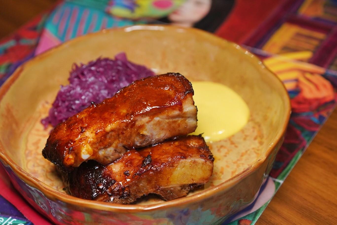 Flanked by braised purple cabbage ‘sauerkraut,’ the ingredients are brought together by a Chinese mustard sauce, enhanced by a lingering sweetness owed to the addition of local honey.
