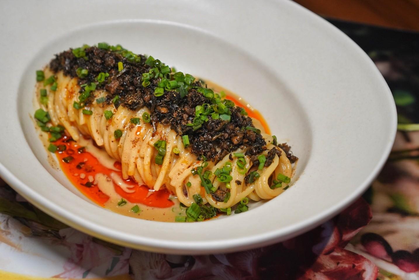 A crumbly topping consisting of minced vegan-friendly Beyond Meat sautéed with customary dan dan mian accoutrement – like pickled Yibin yacai (wild vegetables from Yibin, Sichuan), garlic and ginger – has us questioning if meat is ever really necessary, as we lick a dribble of aromatic chili oil from our glossy, gratified lips.
