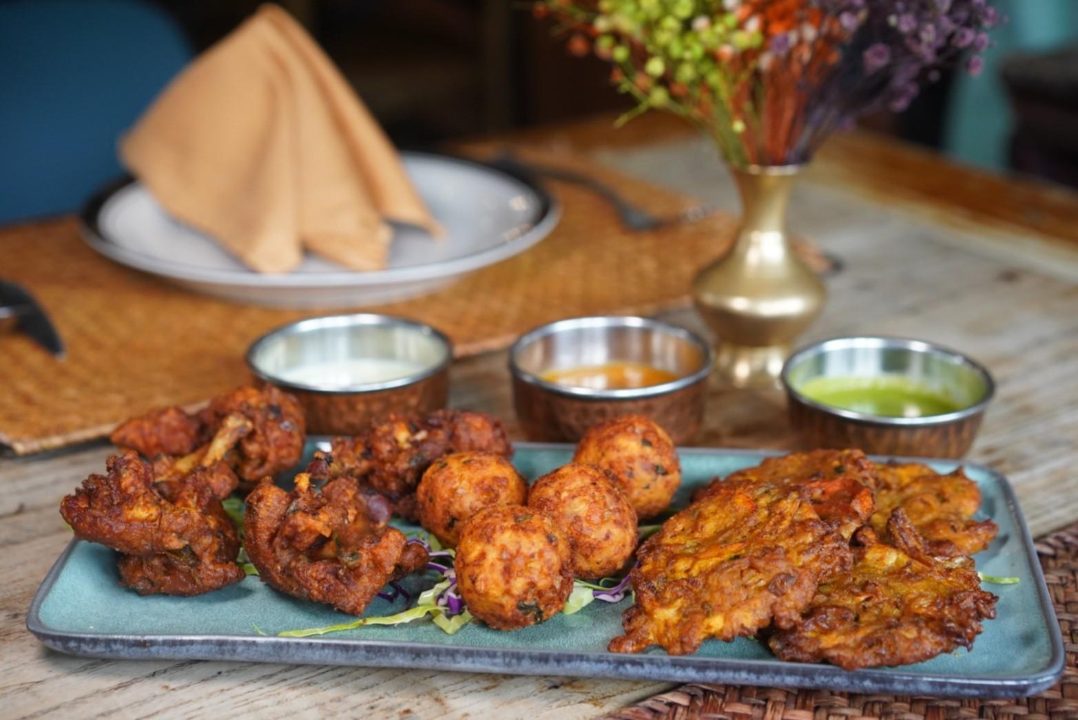 The set includes four Vegetable Pakoda – minced veggies marinated with Nepalese spices and deep fried; four Chicken Sticks – lollipopped, spice-marinated, and fried chicken wings; and – our personal favorite – four Cheeseballs.