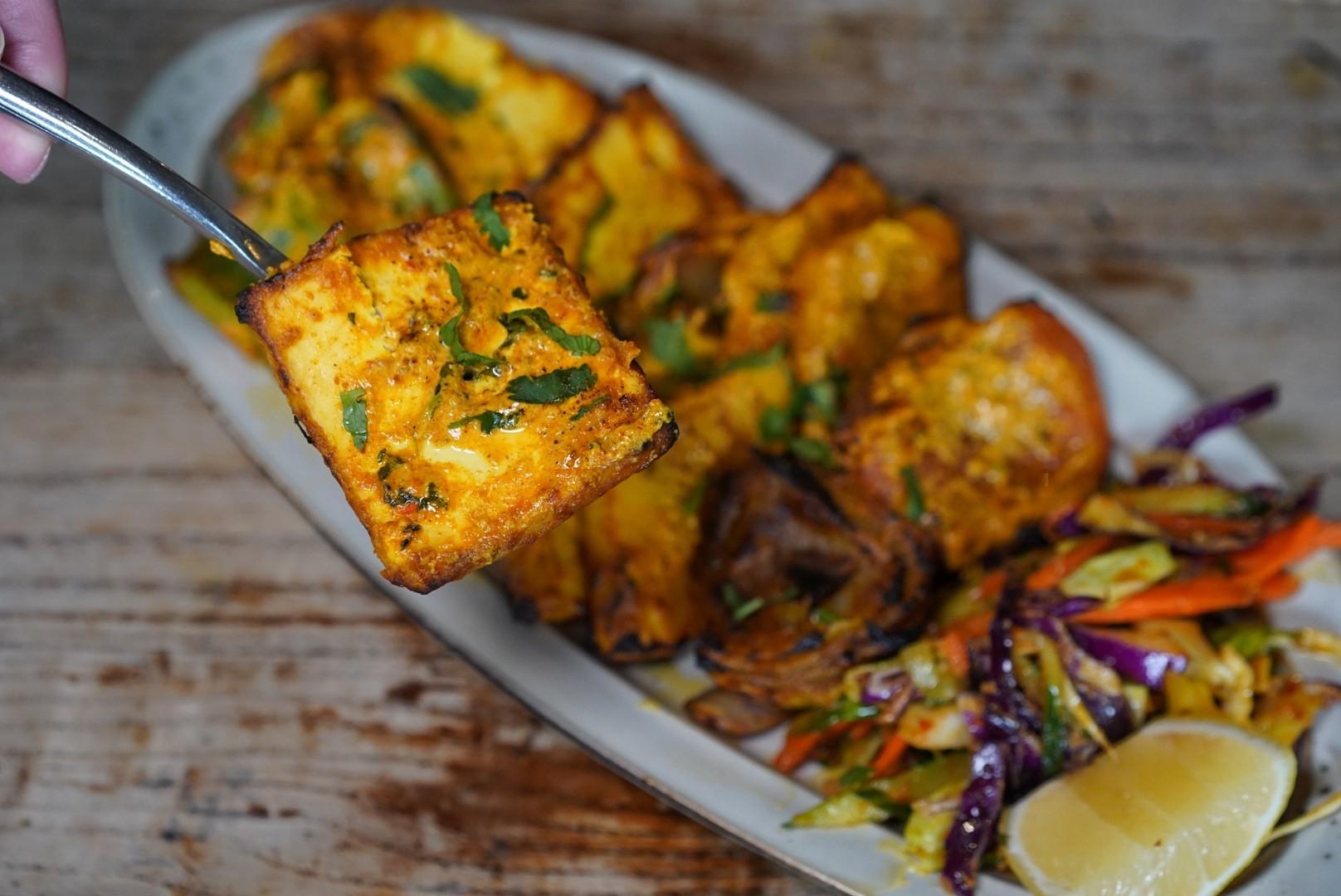Homemade paneer is slathered in a spiced yogurt blend and grilled in the tandoori oven alongside fresh pineapple and an assorted vegetable kebab (all equally spice and sauce-coated).