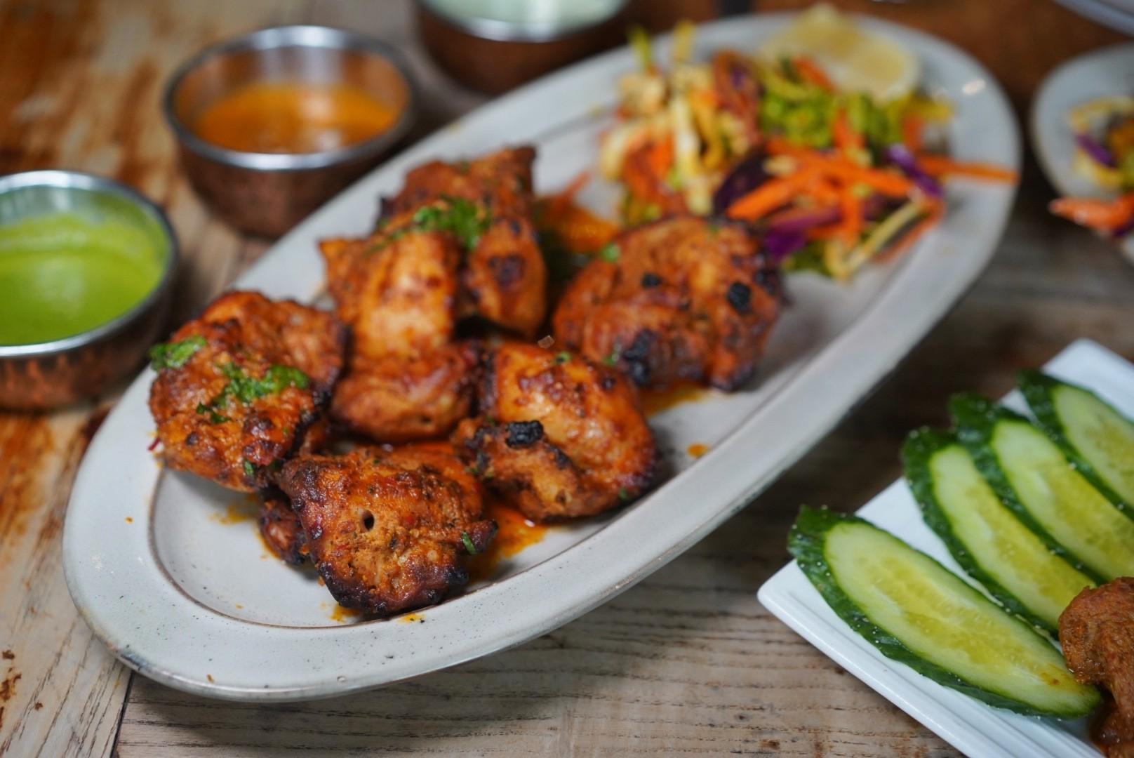 Basted in a spiced yogurt curd overnight, large nuggets of chicken are skewered and roasted in a flaming hot tandoori drum oven as the long-beloved Chicken Tikka (RMB83).