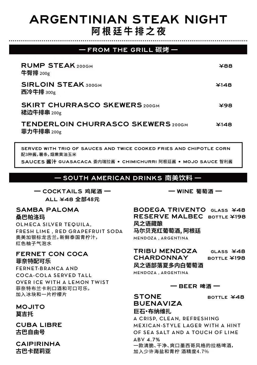 With every good steak dinner you can’t forgo the drinks, whether you pair with a Malbec from Mendoza, the classic Argentinean cocktail Fernet con Coca – also known as Fernando – or the Samba Paloma, which packs a refreshing kick. And all drinks on the special menu are just RMB48, so there is no excuse to not try each one...