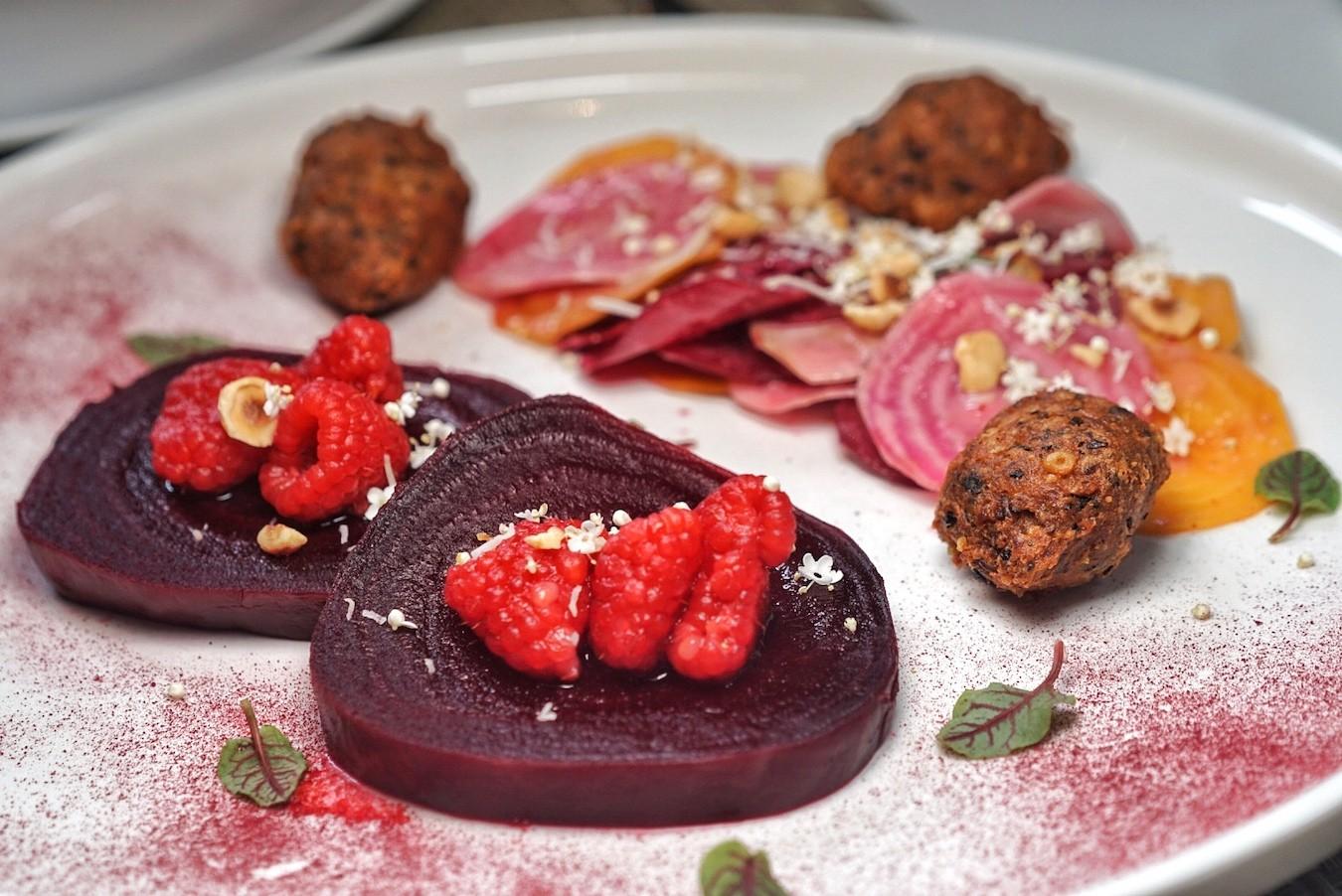 A crunchy tri-colored beet salad with hazelnuts showcases this root vegetable’s diverse uses, while more vegan meatballs add extra heft to round out the meal.