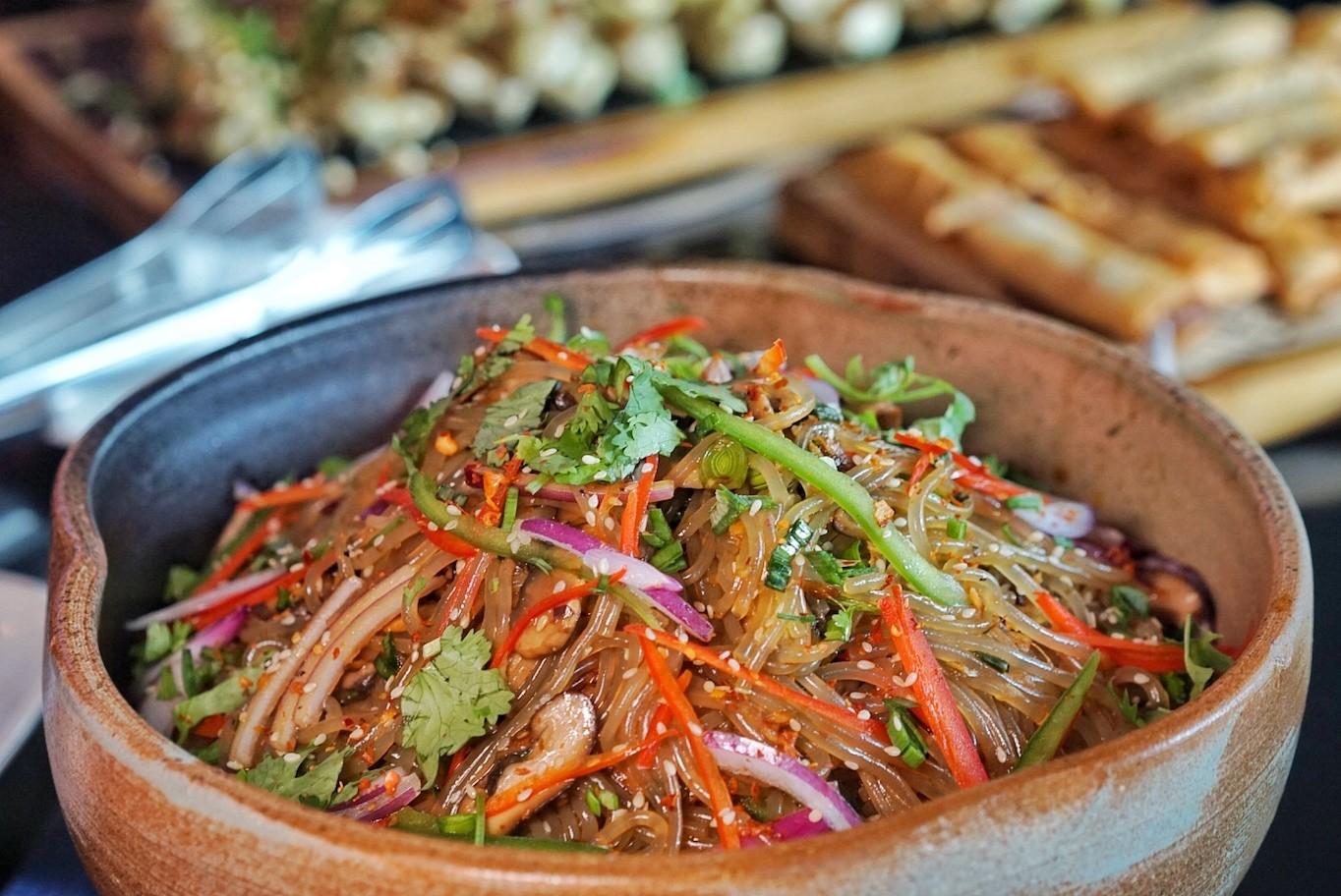 We’re talking everything from the usual suspects – egg and cheese sandwiches, hash browns, cheesy scrambled eggs, breakfast sausage, bacon and Mexican brunch burritos – to fusion stations that include a pho making setup, lemongrass chicken skewers with peanut sauce, shrimp and pork spring rolls, and sweet potato noodle japchae with kimchi.