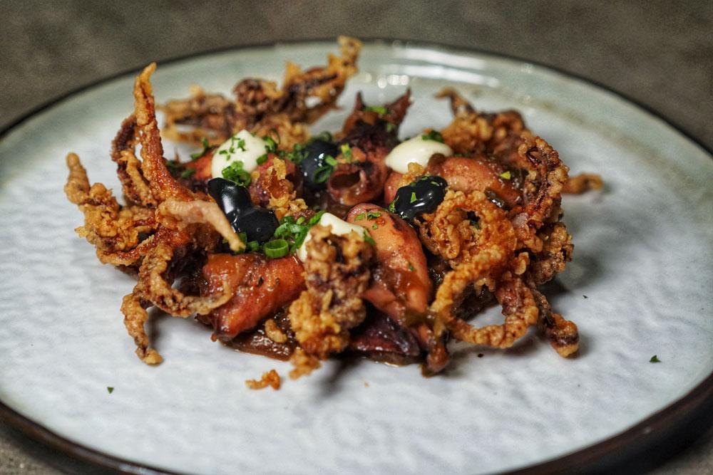 The textural contrast between the deep-fried squid legs and pan-fried squid heads in the Txipirones Pelayo (RMB78), together with the color juxtaposition of the black squid ink aioli and white mayonnaise, makes this eye-catching dish noteworthy.