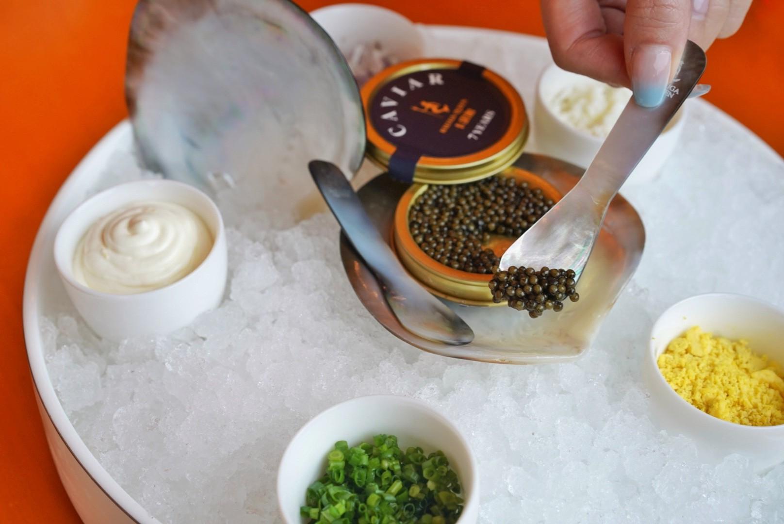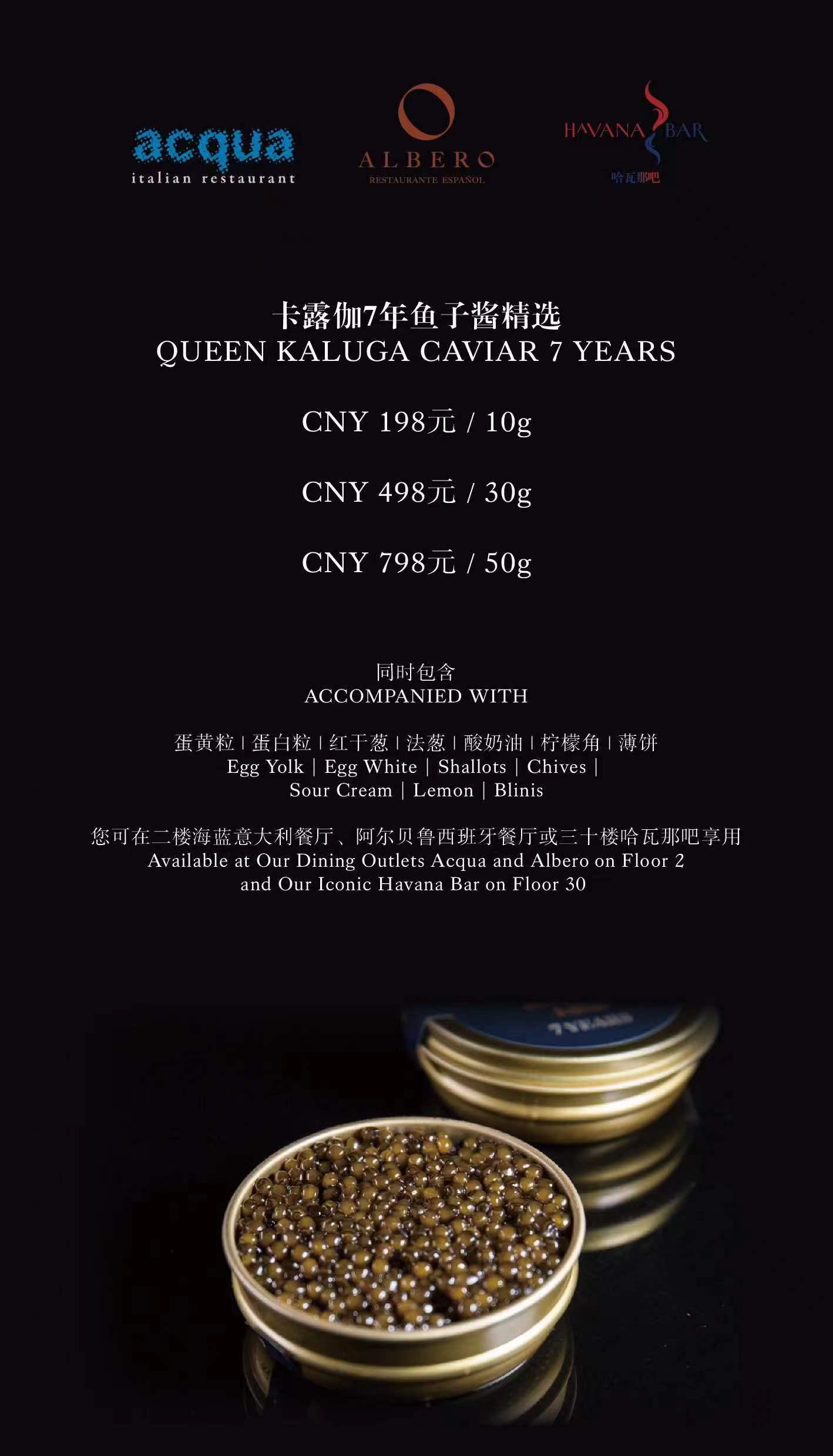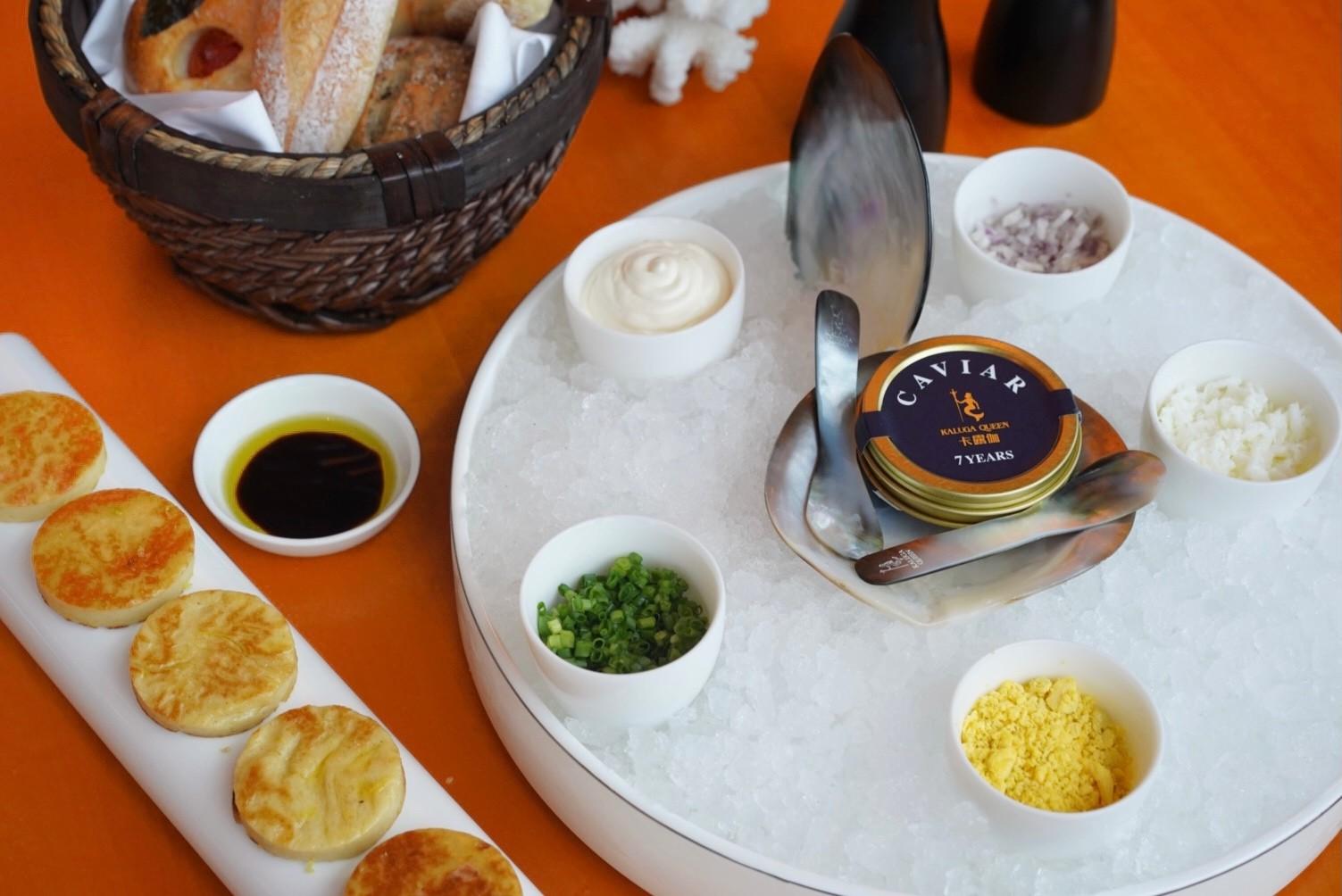 Indulge in Queen Kaluga Caviar 7 Years (RMB198/10 grams, RMB498/30 grams, RMB798/50 grams) from Hangzhou, accompanied with blinis, sour cream, chopped egg yolk and white, shallots, scallions and lemon.