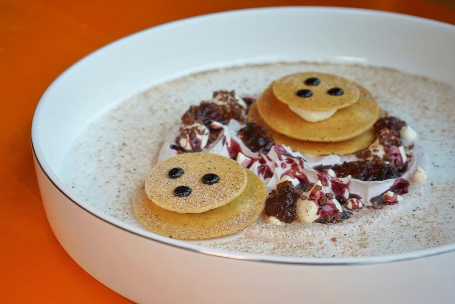 A dribble of marsala red wine sauce is balanced by coffee jelly, popping chocolate candies, and a dusting of cinnamon and cocoa powder.