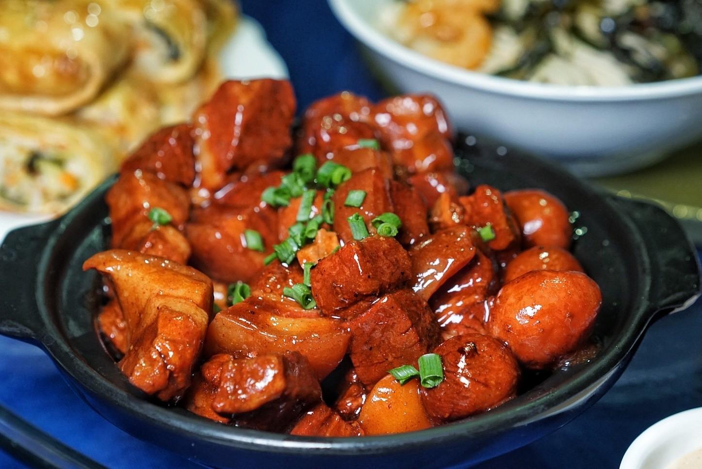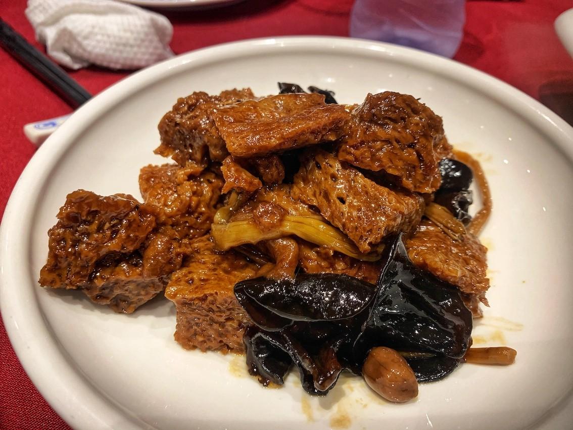 Starting with the classics, the Braised Wheat Bean (RMB38), known colloquially as kaofu, is a textbook example of this red-braised cold appetizer. The sponge-like texture of the wheat gluten absorbs the sticky, sweet sauce, and alternating bites of springy wood-ear mushrooms and crunchy peanuts make it a favorite amongst vegetarians and meat-eaters alike.
