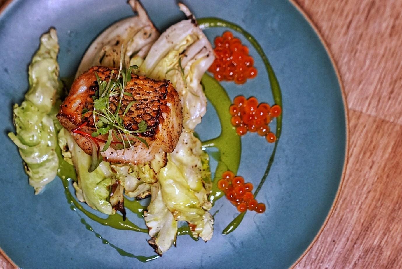 A purist would admire the epic sear on the Tooth Fish (RMB168) exterior, but may be surprised by the choice of charred cabbage it rests on – an unconventional side and plating choice that proves to be both logical and downright delicious. A swirl of fresh herb pesto plus glistening beads of salmon roe send the dish whirling in a different direction, but one that we want to follow.