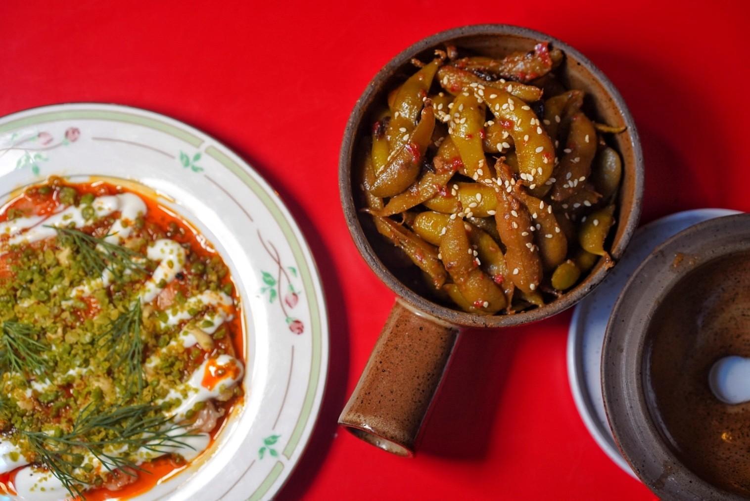 An ode to alley-side BBQ stall eats in Tainan – Taiwan's ancient capital – the Edamame (RMB38) are stir-fried then marinated overnight in a fermented black bean sauce with chili and garlic, culminating in an addictingly crushable umami bomb.