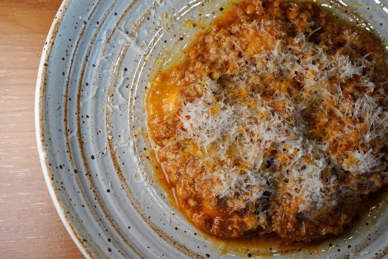 For one of the newest offerings, unavailable at Scarpetta, the Orange Ricotta Ravioli (RMB128) is sprinkled with candied orange flecks, a sweet citrus pop that enhances the pillows of al dente pasta and stewed Italian five spice pork.