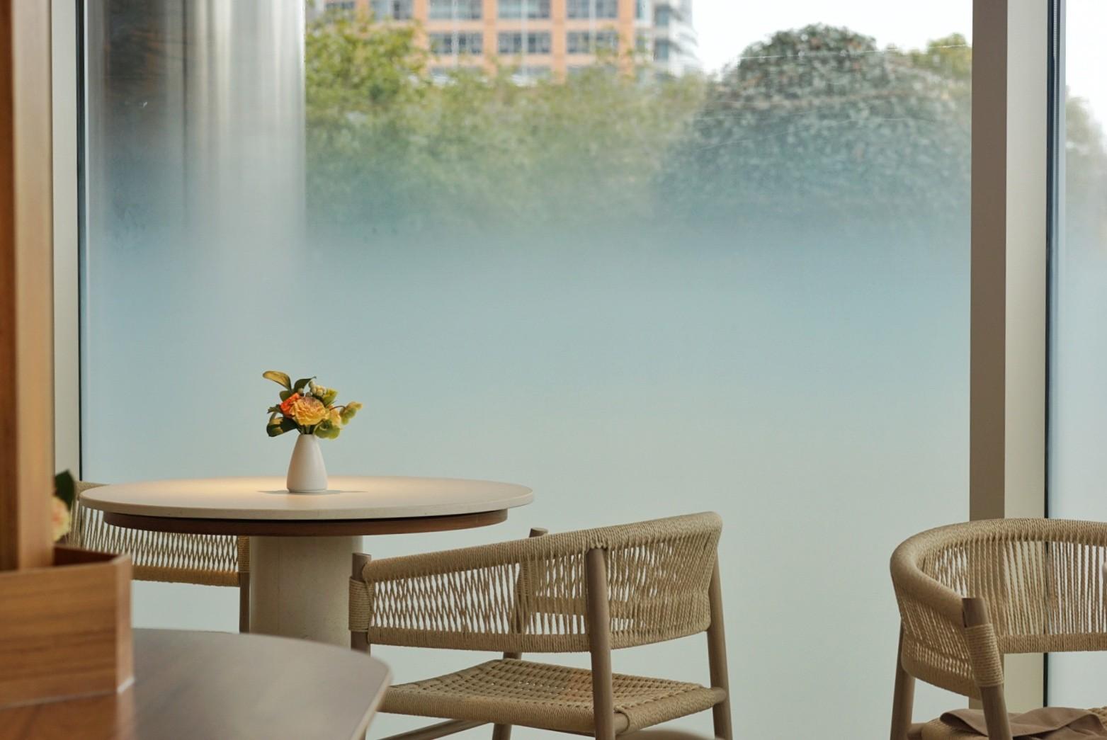 Outfitted in warm hues of cream and dusty rose, light wood accents and plants abound. The domed ceilings – inspired by Italian cathedral architecture – add to the airy feel, with views of the Huangpu River.