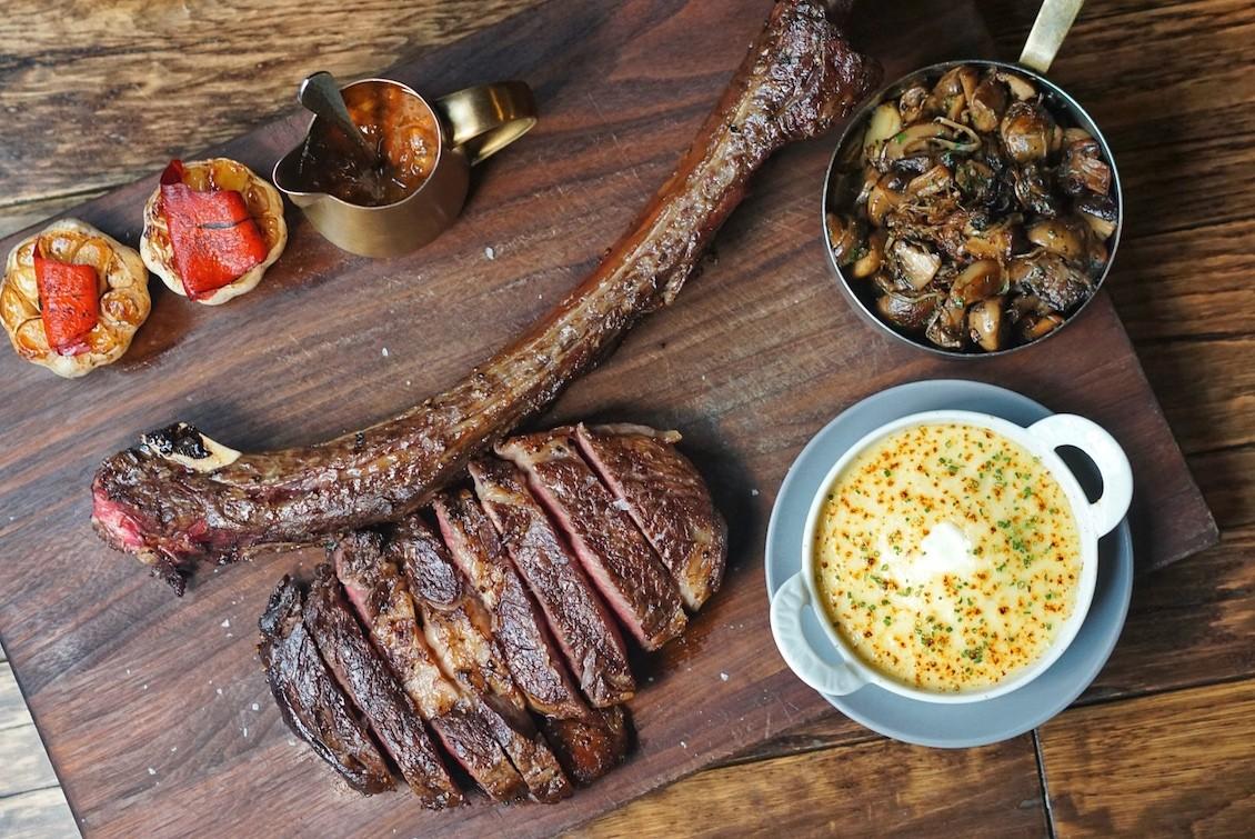 All steaks come with a choice of two sides – like truffle French fries; mashed potatoes baked with sour cream and parmesan; garlic or creamed spinach; a blend of porcinis, Portobello and black mushrooms cooked in garlic butter and parsley; or a corn, bean and bacon lardon succotash – plus freshly baked Parker house rolls and flavored butter.