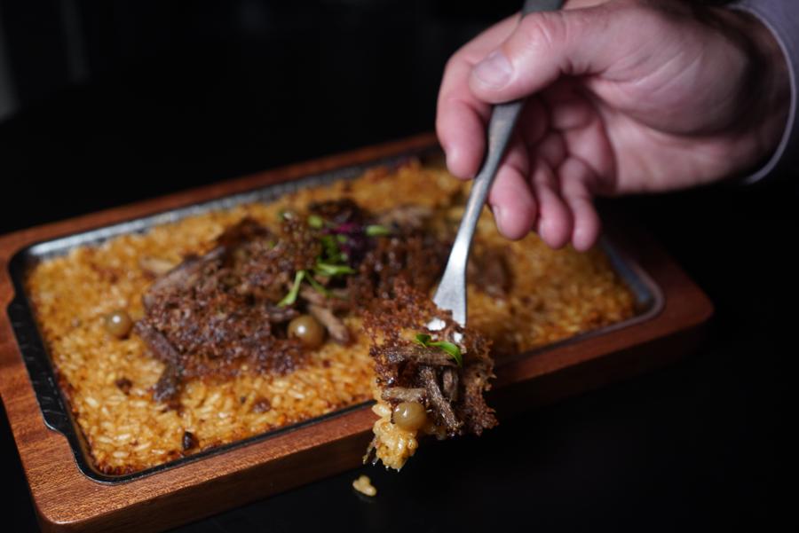 As for mains, expect to find elevated Cantonese roast goose – in shredded meat and crispy chip-like skin forms – when hoovering the Silly Goose Paella (RMB168). But the prize is the smoke-imbued fat-speckled goose liver sausage from Guangdong and lip-pucker-inducing pickled gooseberries.
