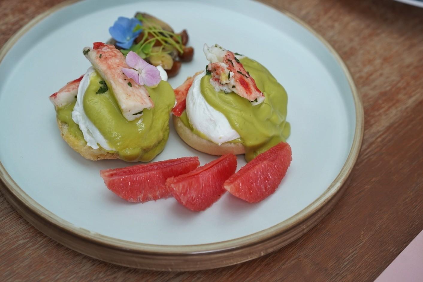 Perched atop a baked fresh daily English muffin slathered in a citrusy avocado hollandaise, the succulent shreds of crab leg lend a hint of natural sweetness, rounded by a pickled wild mushroom salad and fresh grapefruit segments.