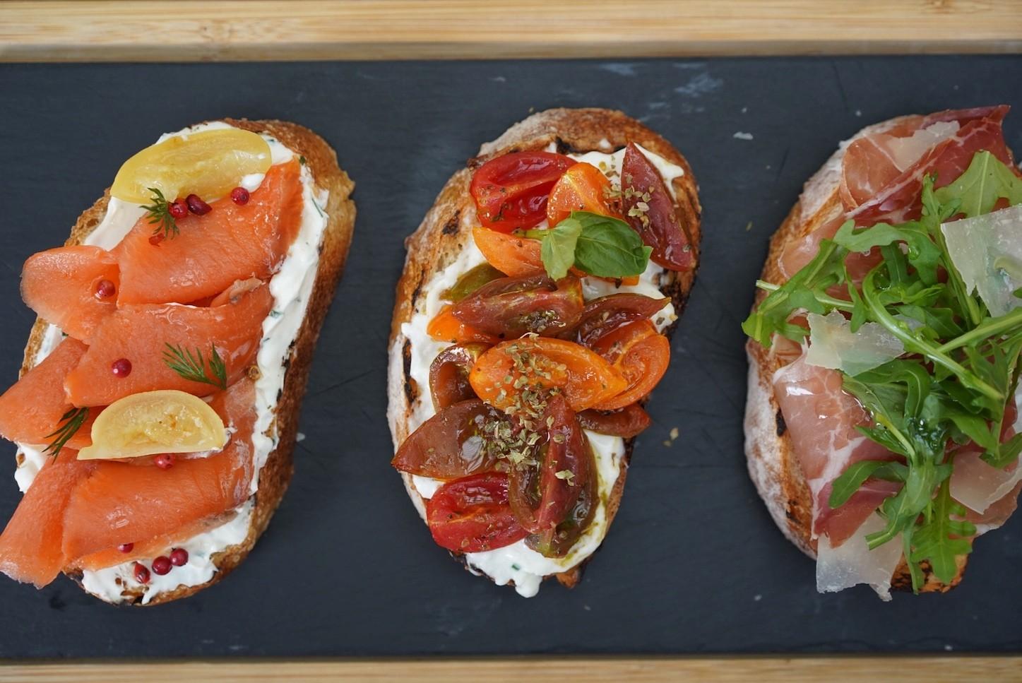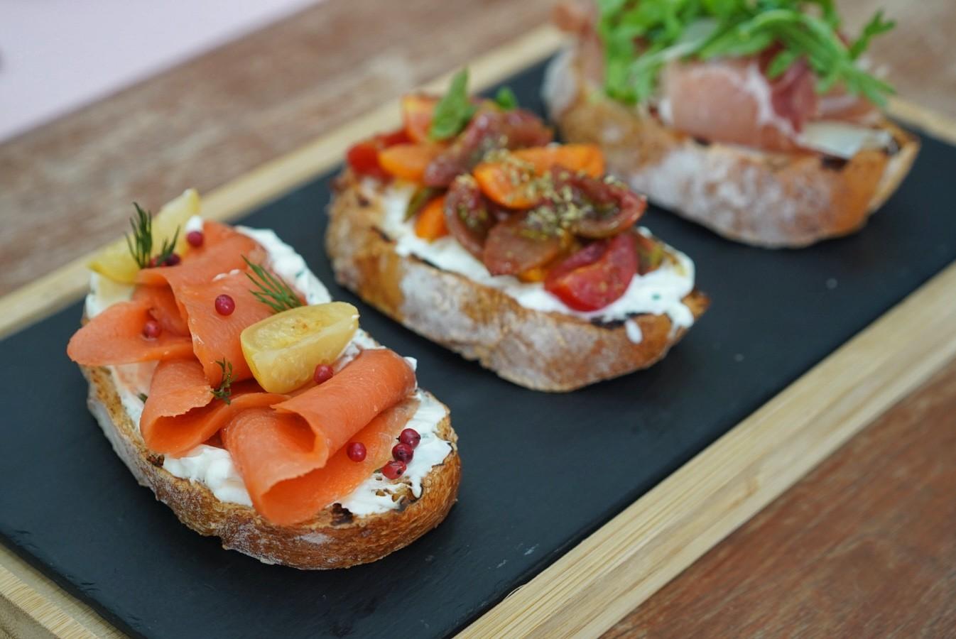 A trio of Bruschetta is equally ideal for sharing – with grilled sourdough toast topped with Serrano ham, arugula shaved parmesan, and a lashing of white truffle oil; a creamy spread of stracciatella cheese, marinated heirloom tomatoes and fresh basil; and herb cream cheese, smoked salmon pink peppercorns, flecked with pickled baby lemons.
