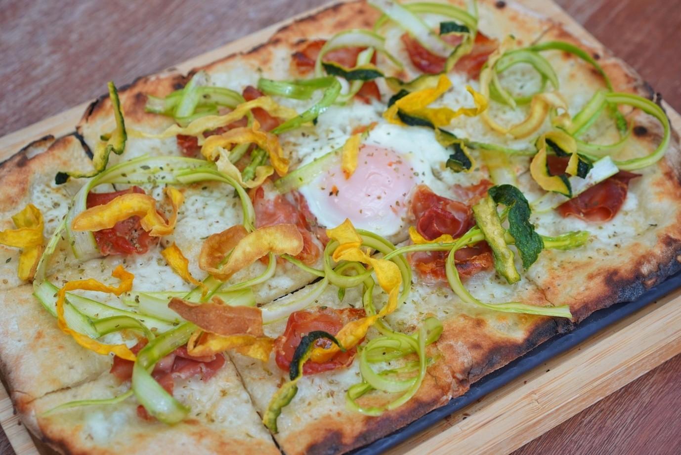 Liberally spread with fresh buffalo mozzarella, the pizza sees a verdant spread of spring’s bounty – shaved asparagus, tri-colored zucchini chips, a soft-poached egg, Iberico ham, lemon zest, and a dusting of oregano – all baked in their custom-built pizza oven.