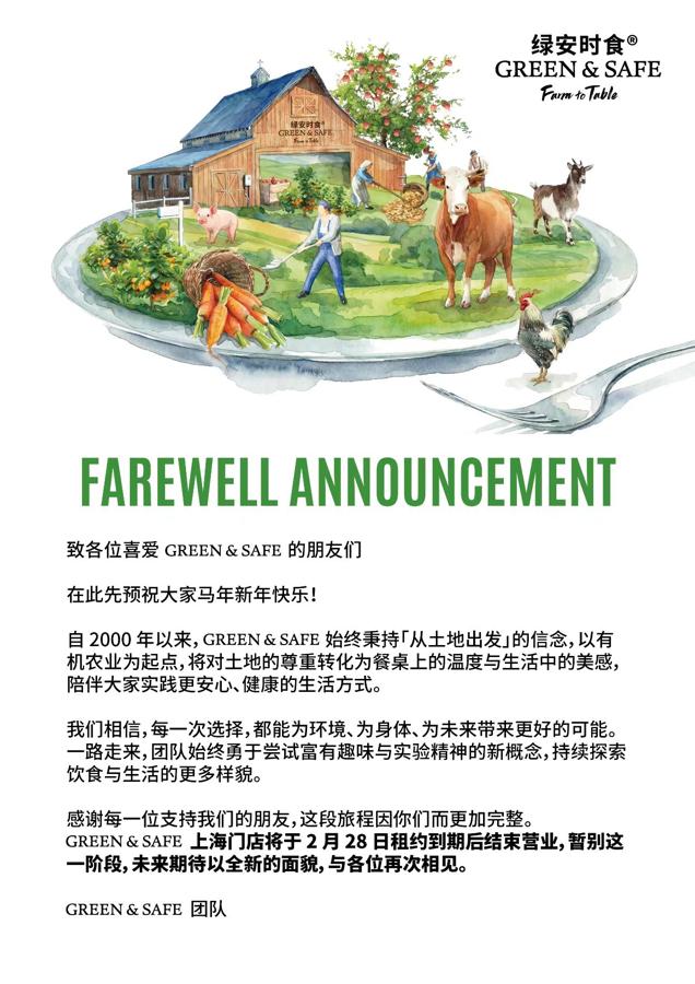 After a whopping 26 years of serving the Shanghai community, we are sad to report that Green&Safe, one of Shanghai’s original health-focused eateries and organic grocers, will shutter its doors at the end of this month, according to a statement published on their Official WeChat Account. This eco-conscious, western-style restaurant and organic food supplier has focused on farm-to-table dining with fresh, locally-sourced produce since its inception in 2000. Managed by the Taiwanese group (also behind the now shuttered Qimen Organic Hotpot), the team has decided not to renew their lease following Chinese New Year.