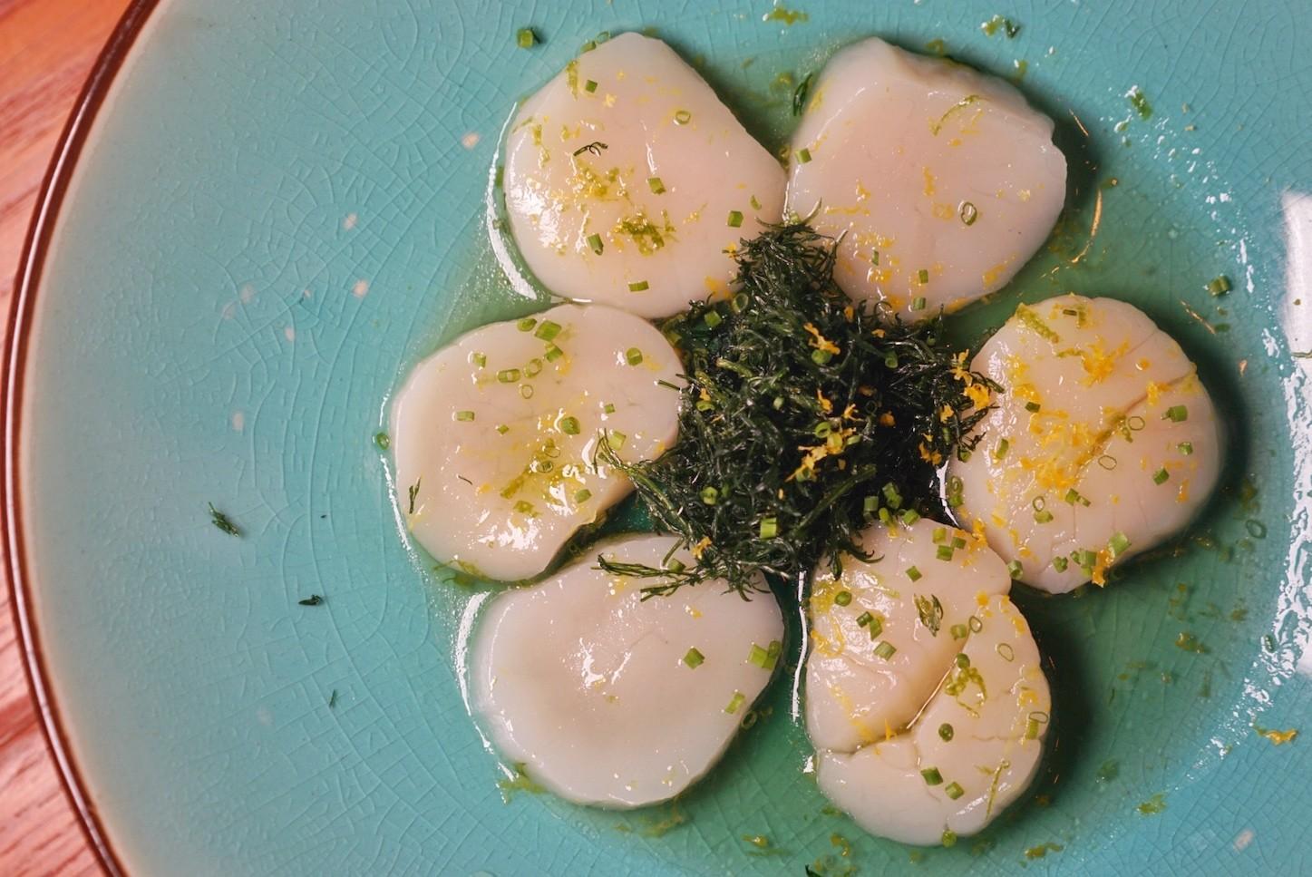 Instead, each presentation is paired with thoughtful textural components, like crunchy bamboo rounds and juicy mandarin segments folded inside thickly-sliced Salmon (RMB88); a whipped oroshi (purée) of apple and daikon anchoring pleats of Yellowtail (RMB78); or vinegar-soaked dill sprinkled atop a petal-like display of Scallops (RMB118).