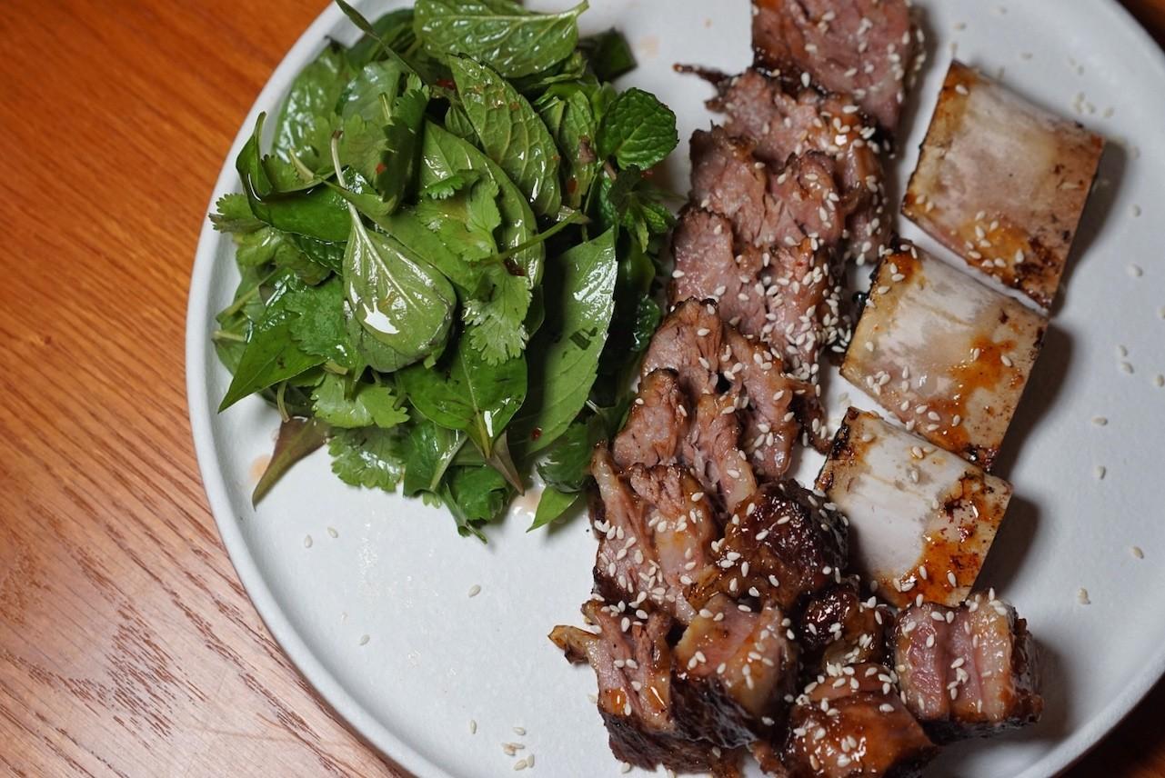 There are also heftier options: chili-glazed Iberico Pork Ribs (RMB128), with meat that slinks off a completely clean bone; herb-rubbed Lemongrass Butter Chicken (RMB128), enhanced by a gasp of scorched lemon; and seared Beef Shortrib (RMB188), juxtaposed against a raw herb salad.